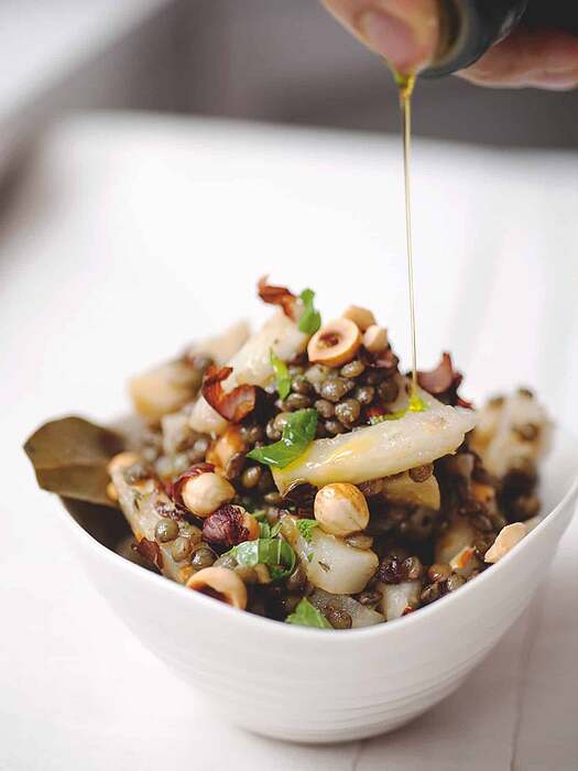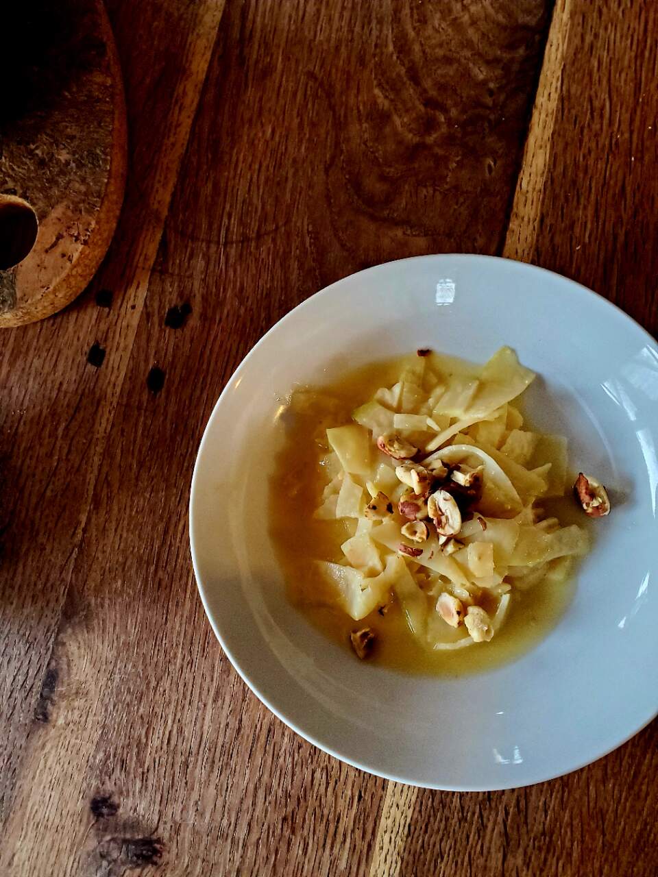 Celeriac is always a bit of a ?? for me. I always make the same things: soup, gratin or remoulade salad. I found this fancy looking recipe that was actually super easy. Would make a “classy” starter for a dinner. Fine ribbons of celery root quickly blanched in a broth made from the skins and butter. Topped with toasted hazelnuts. Looked pretty and was pretty delicious.