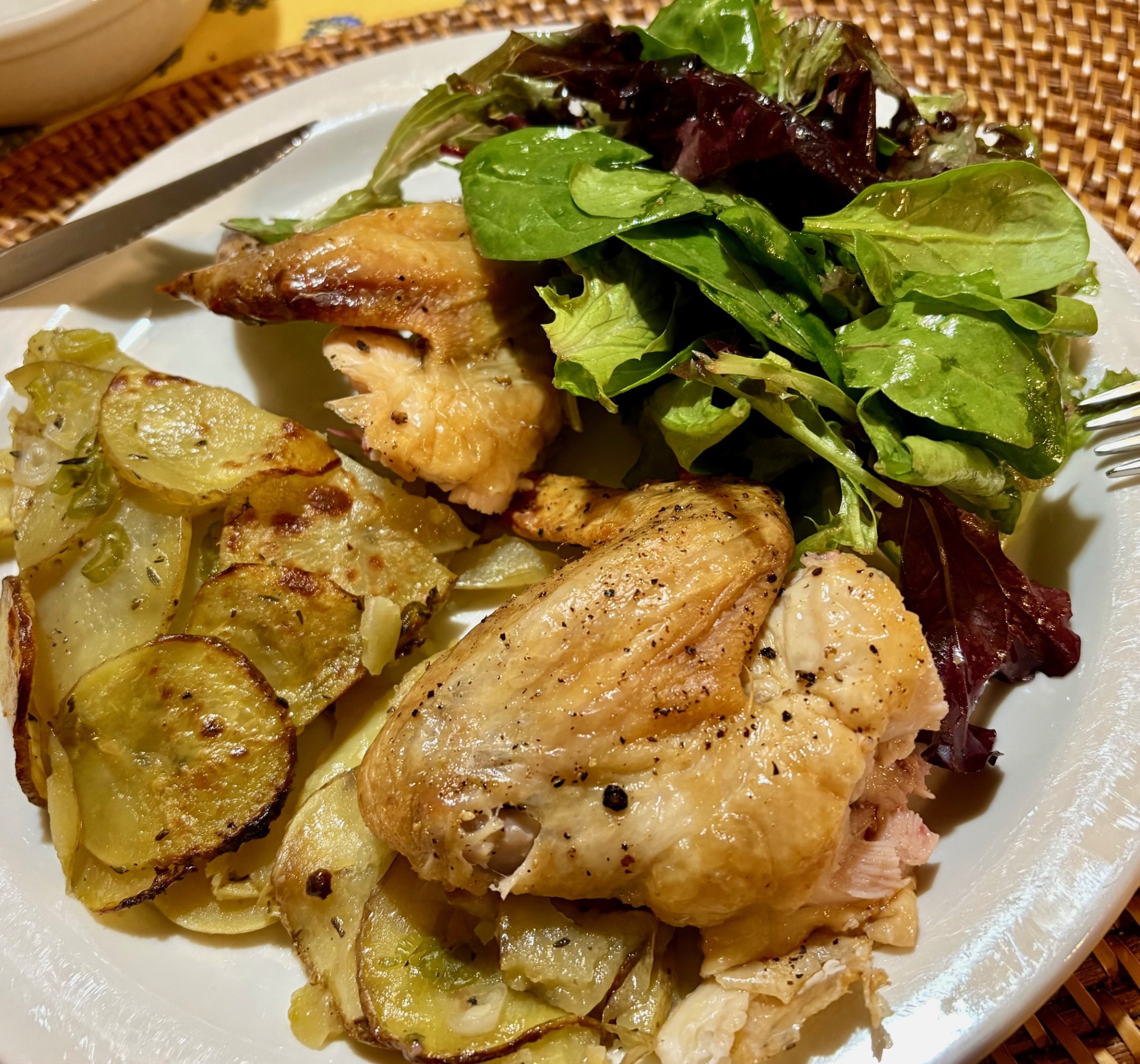 Tonight . Half tomatoes and potatoes with rosemary. Served with a salad and ground chuck patty . Cheers .