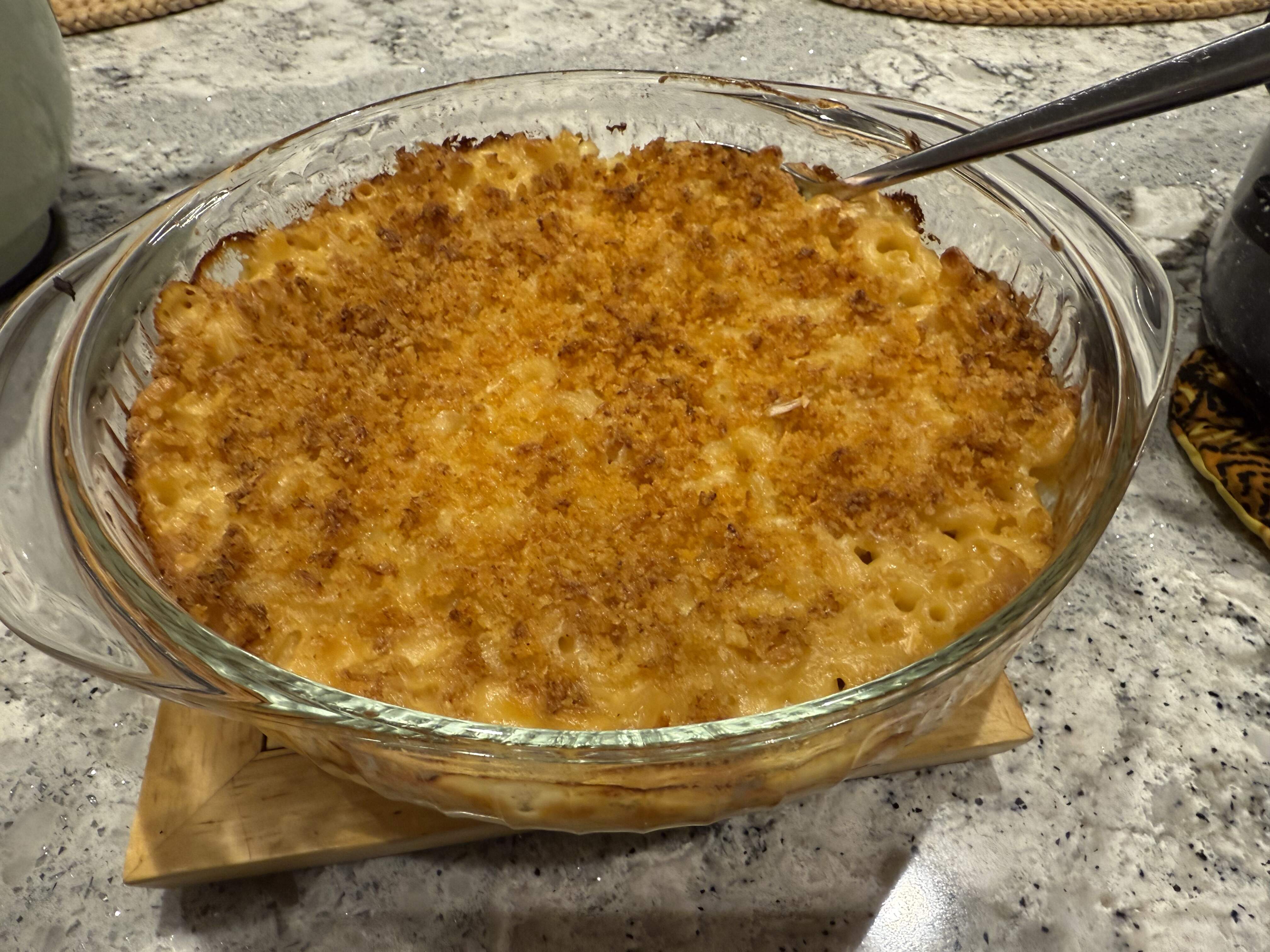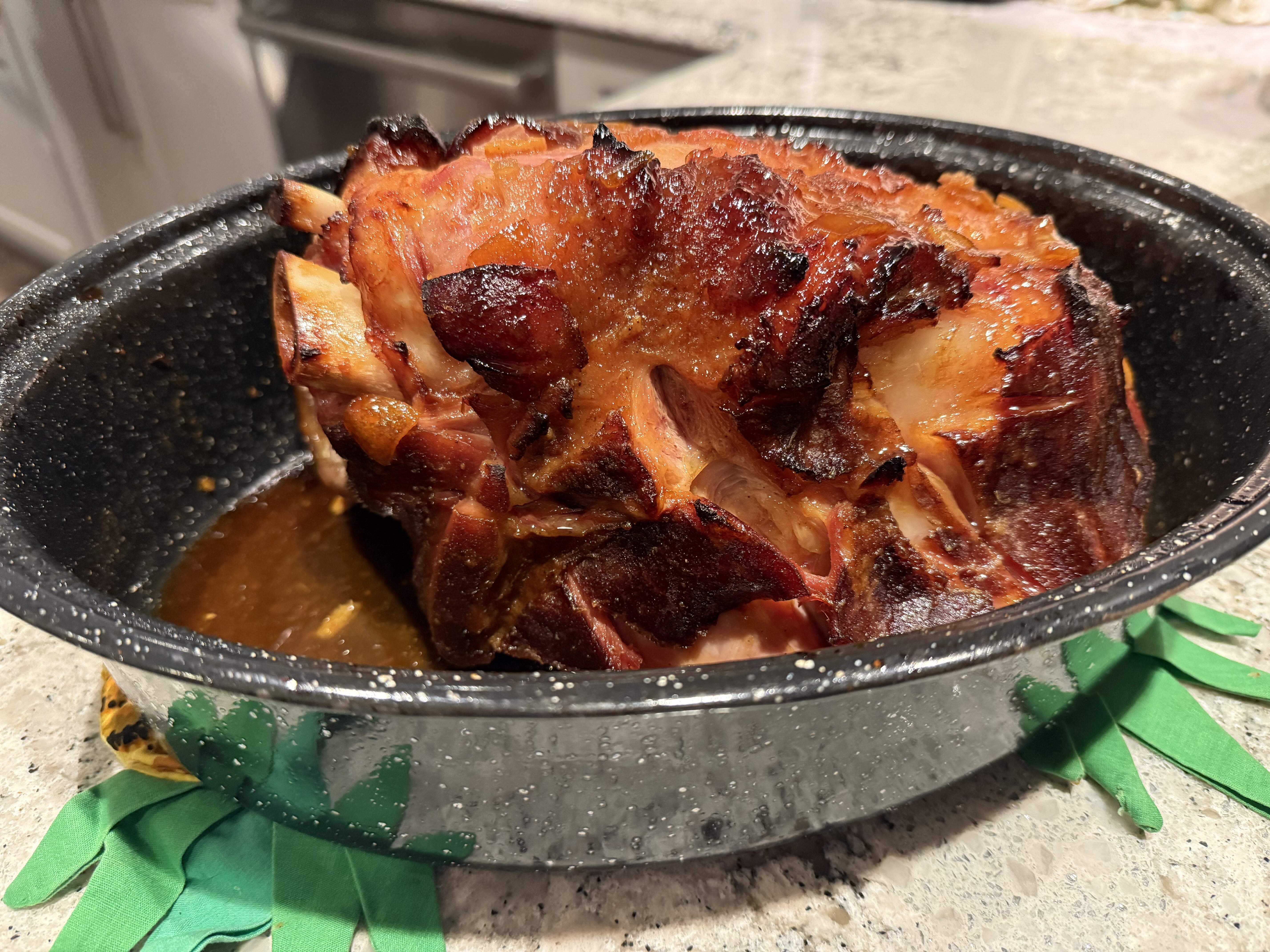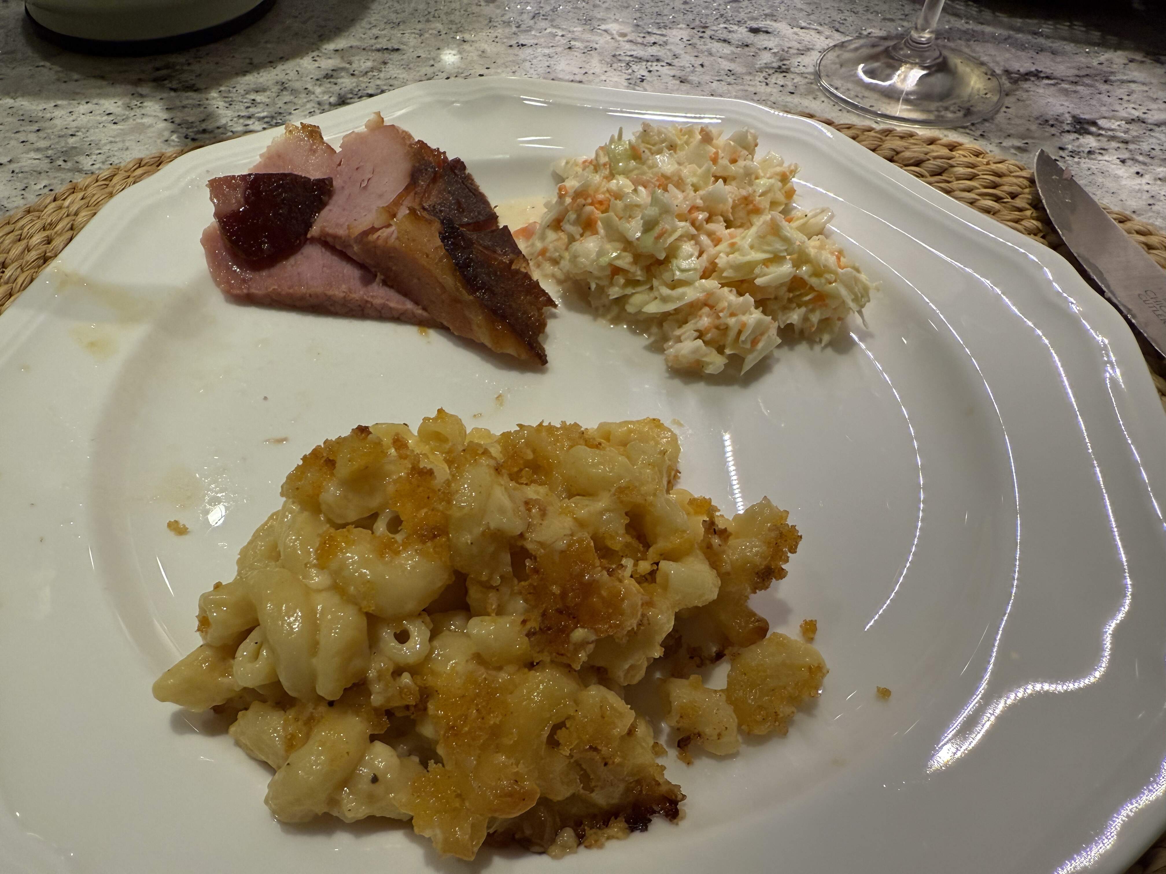 Sunday night dinner: ham baked in orange juice, then glazed with leftover baklava syrup, fortified with extra ground cloves, and Dijon mustard, with about 3 oz of Meyer lemon jam. Also, homemade mac n cheese + slaw.