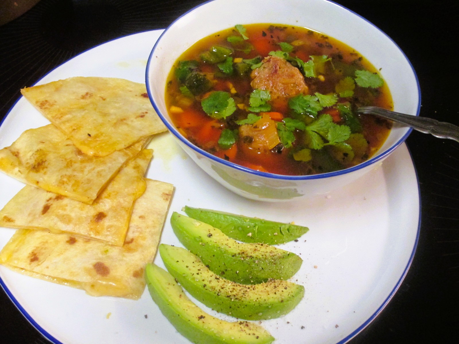 Burning throat, runny nose, am I coming down with something? No just the rare super hot poblano pepper. Albondigas soup, extra sharp cheddar and pepper jack cheese quesadilla, avocado.