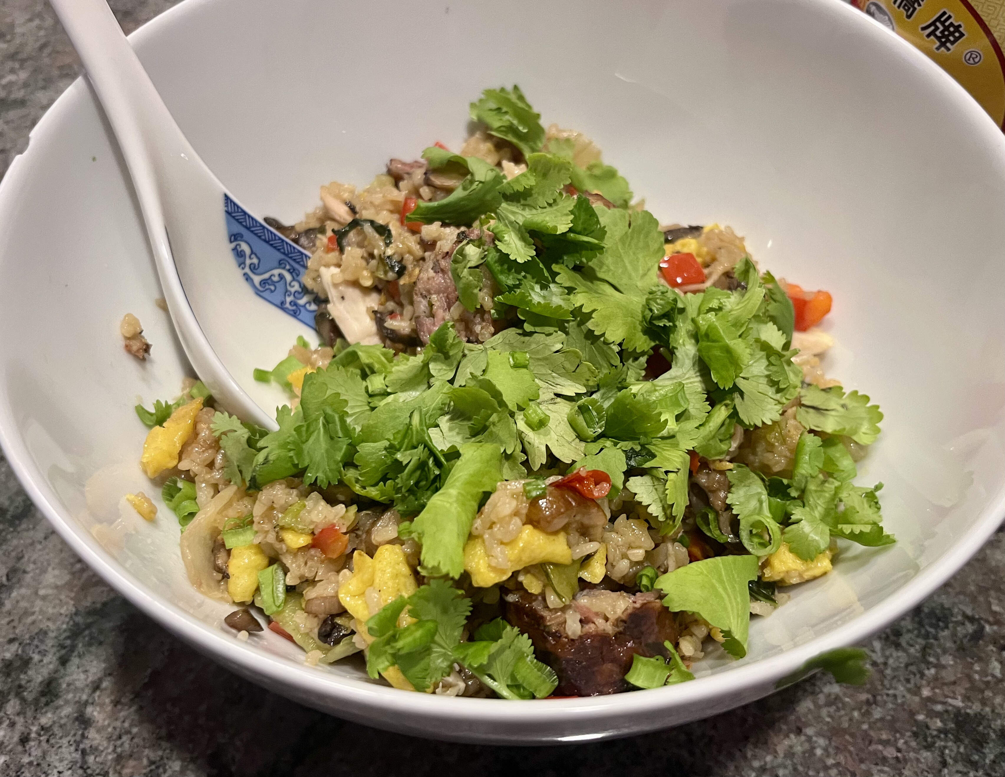 Finished the leftover fried rice from Sunday, to which my PIC added sautéed oyster shrooms & red peppers, and a lil shredded roti chicken.