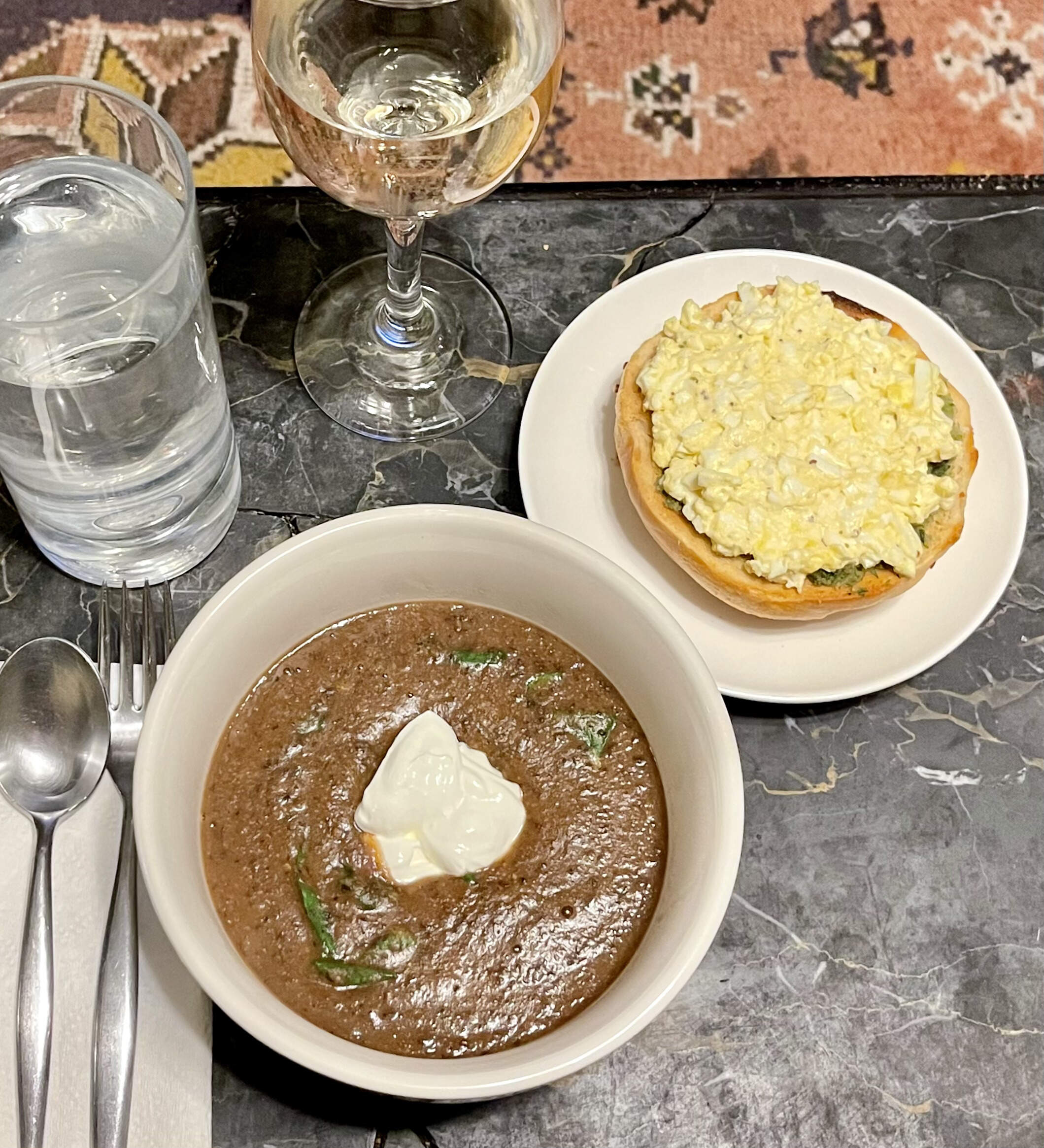 Also egg salad on a half bagel with a little bit of that culantro sauce, which is VERY garlicky and my gut was not pleased. I need to temper this bad boy somehow, or I really will end up poisoning myself.
