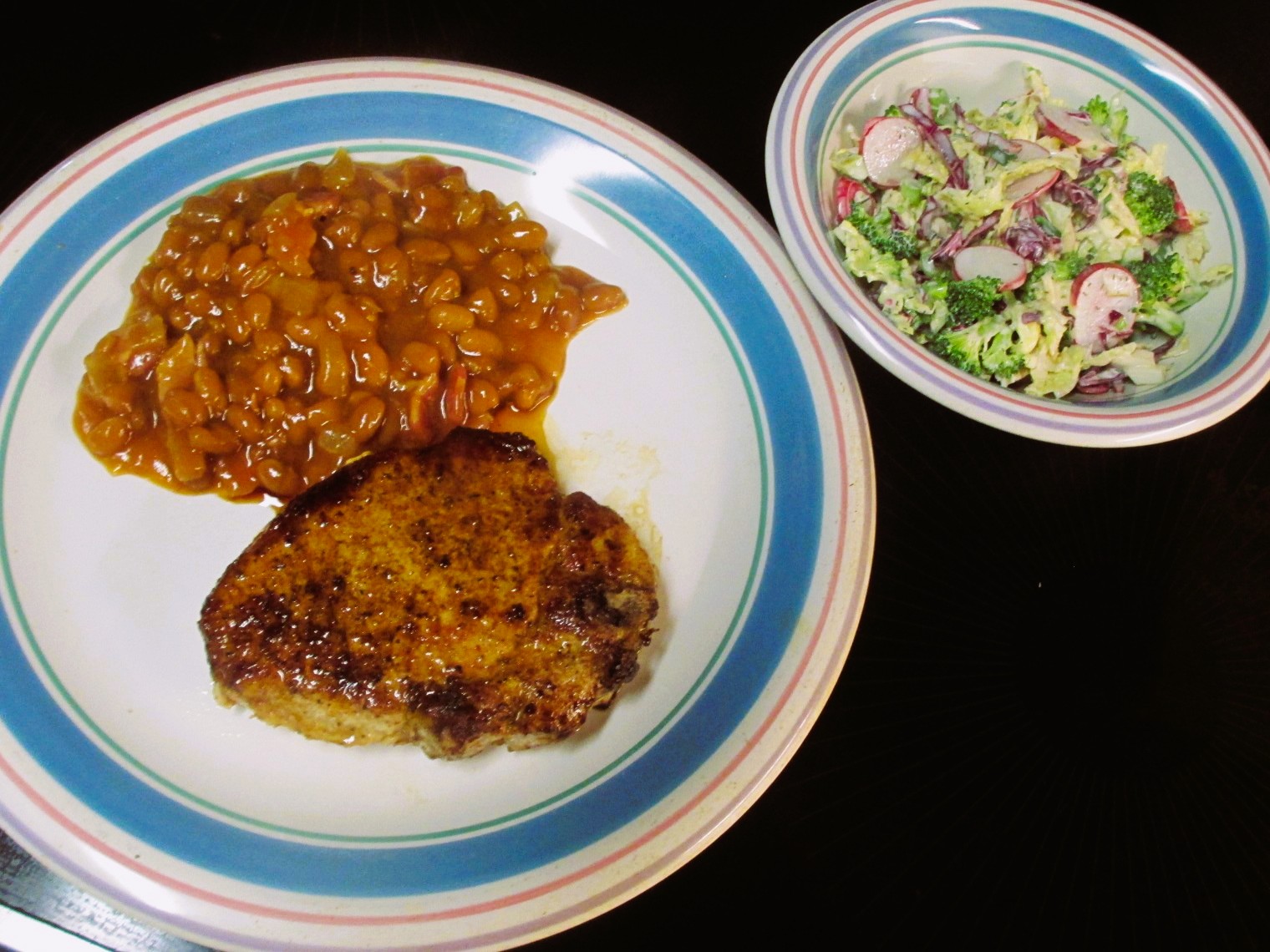 I worked in the yard today it was 70 degrees. Fried pork chop, seasoned with pork rub and pepper. Canned baked beans augmented with onions, ketchup and bacon. Cruciferous slaw with green onion and creamy dill dressing.