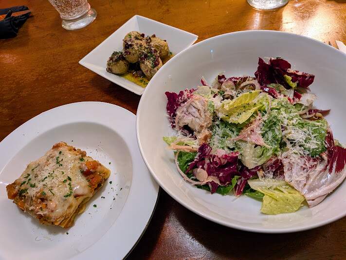 SALAD for me, and friend/neighbor brought us some of her lasagna. Very tender, so it was good for the BF’s dental issues, although the carrots in it kind of threw us off. Still, so kind of her, much appreciated as I had to work late. BF made a little olive dressing for leftover roasted potatoes we had, which were quite yummy.