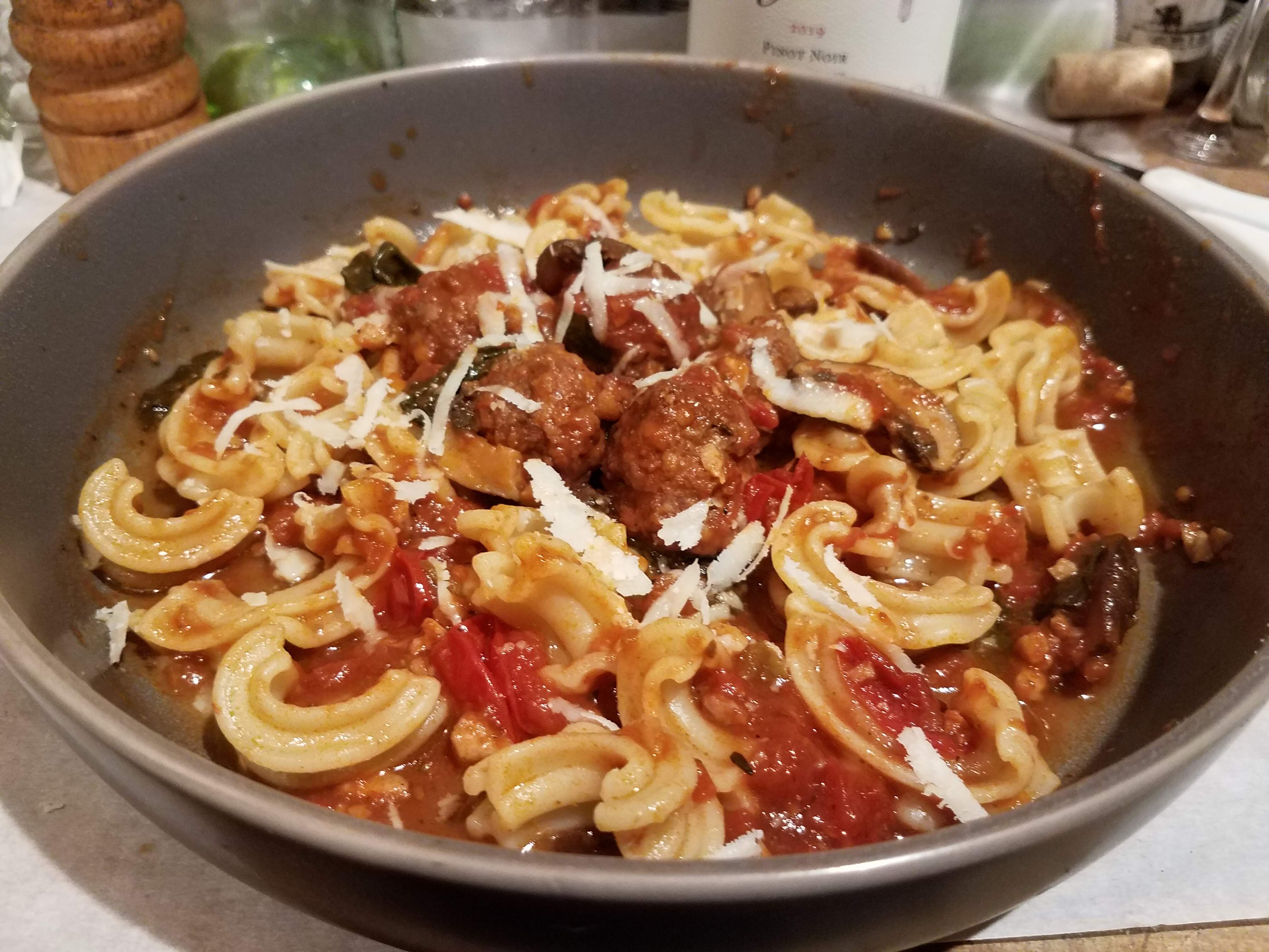 Meatballs again, lamb and pork, air-fryer browned, simmered in a light tomato sauce with mushrooms and spinach, cascatelli and shredded kaseri.