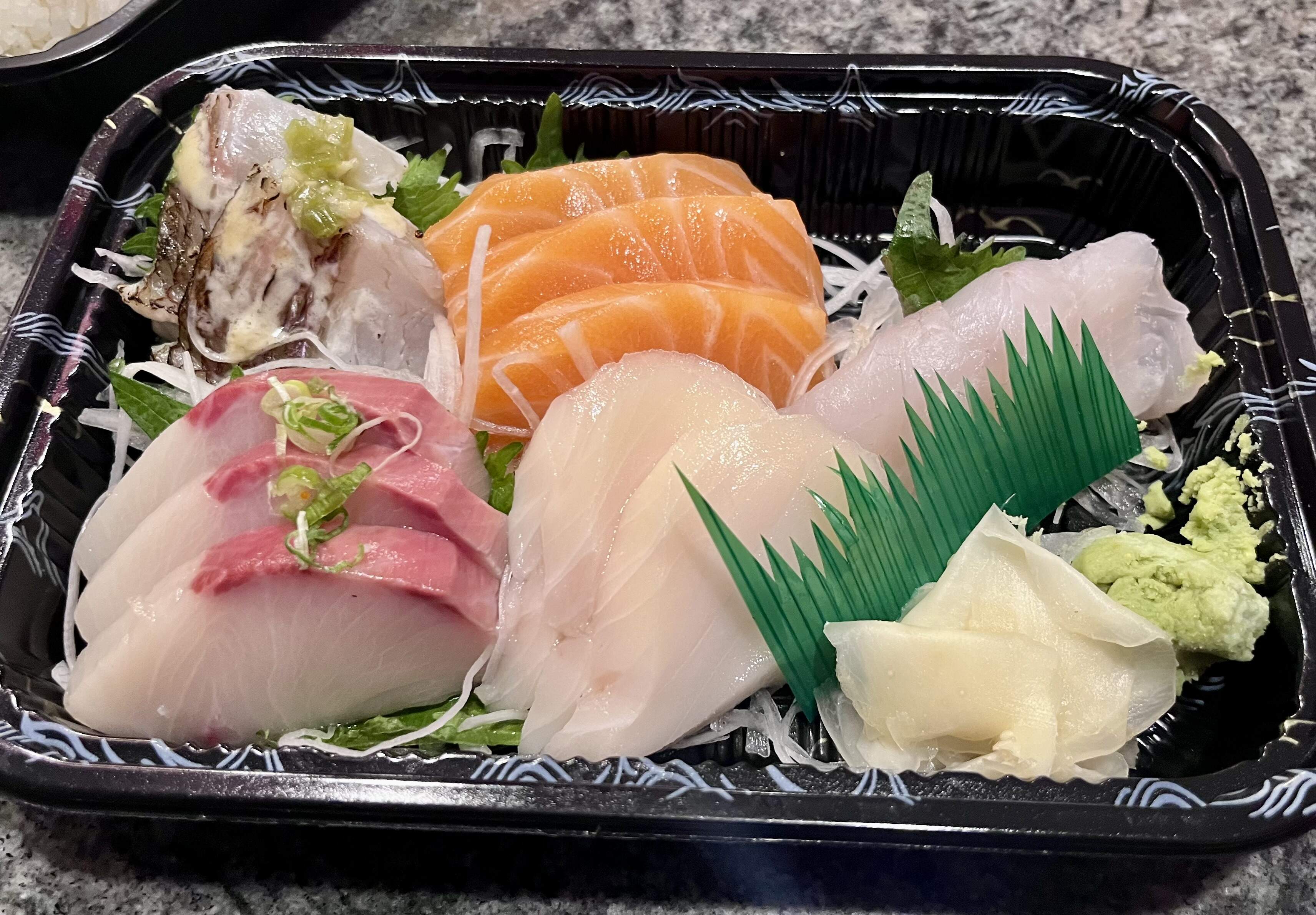 Take-out sashimi (madai, sake, hamachi, escolar, hirame) with a side of rice & a miso soup to share.