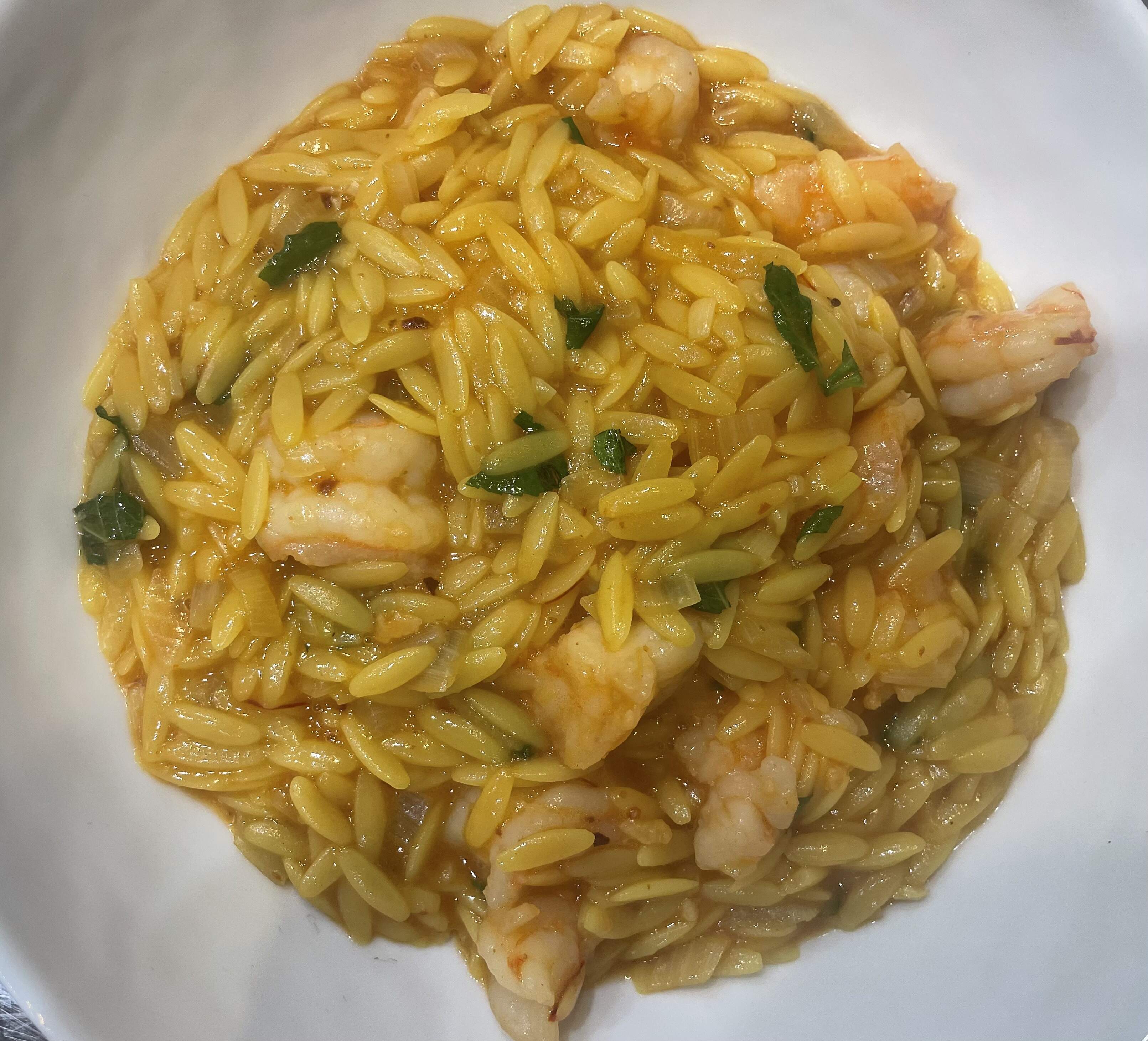 Creamy Saffron Orzo with Spiced Garlic Butter Shrimps from a CI recipe - orzo is kinda cooked risotto style with shallots, garlic, saffron, white wine and chicken broth. The shrimps are quickly panfried and mixed with butter, garlic, aleppo pepper, tomato paste mixture. Everything mixed together and finished with some mint