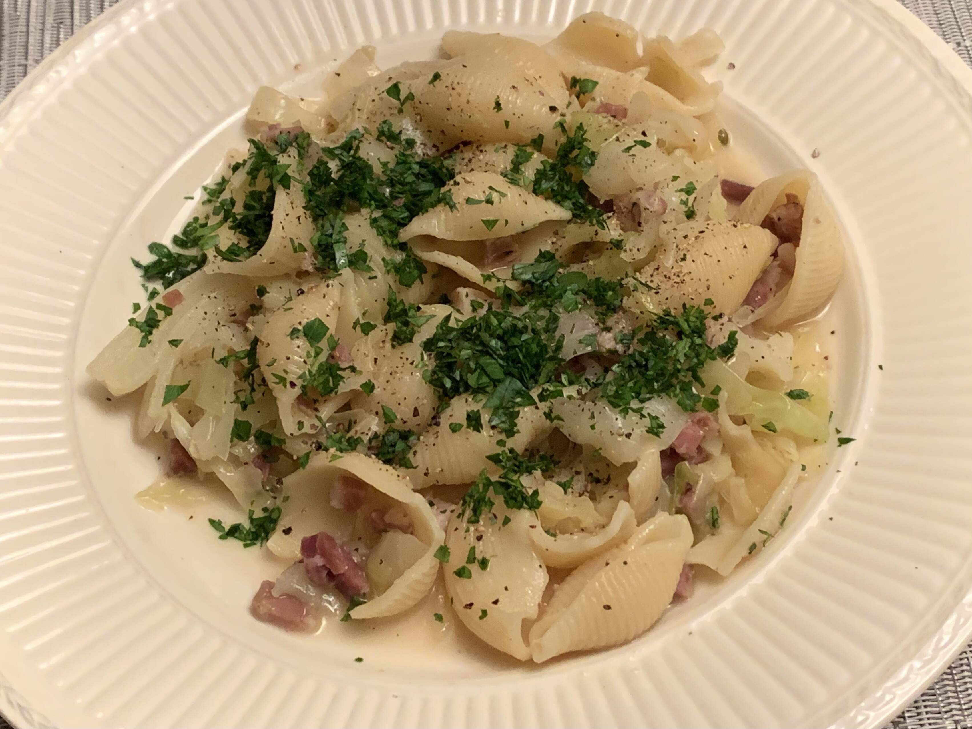 This version of haluski hopped the mountains over into Italy to make use of pantry ingredients I had, including diced pancetta, half butter/half olive oil, and conchiglie pasta. (I didn’t make little dumplings from scratch.) I even deglazed the braised cabbage and onion mixture with a splash of white wine—totally non-traditional.