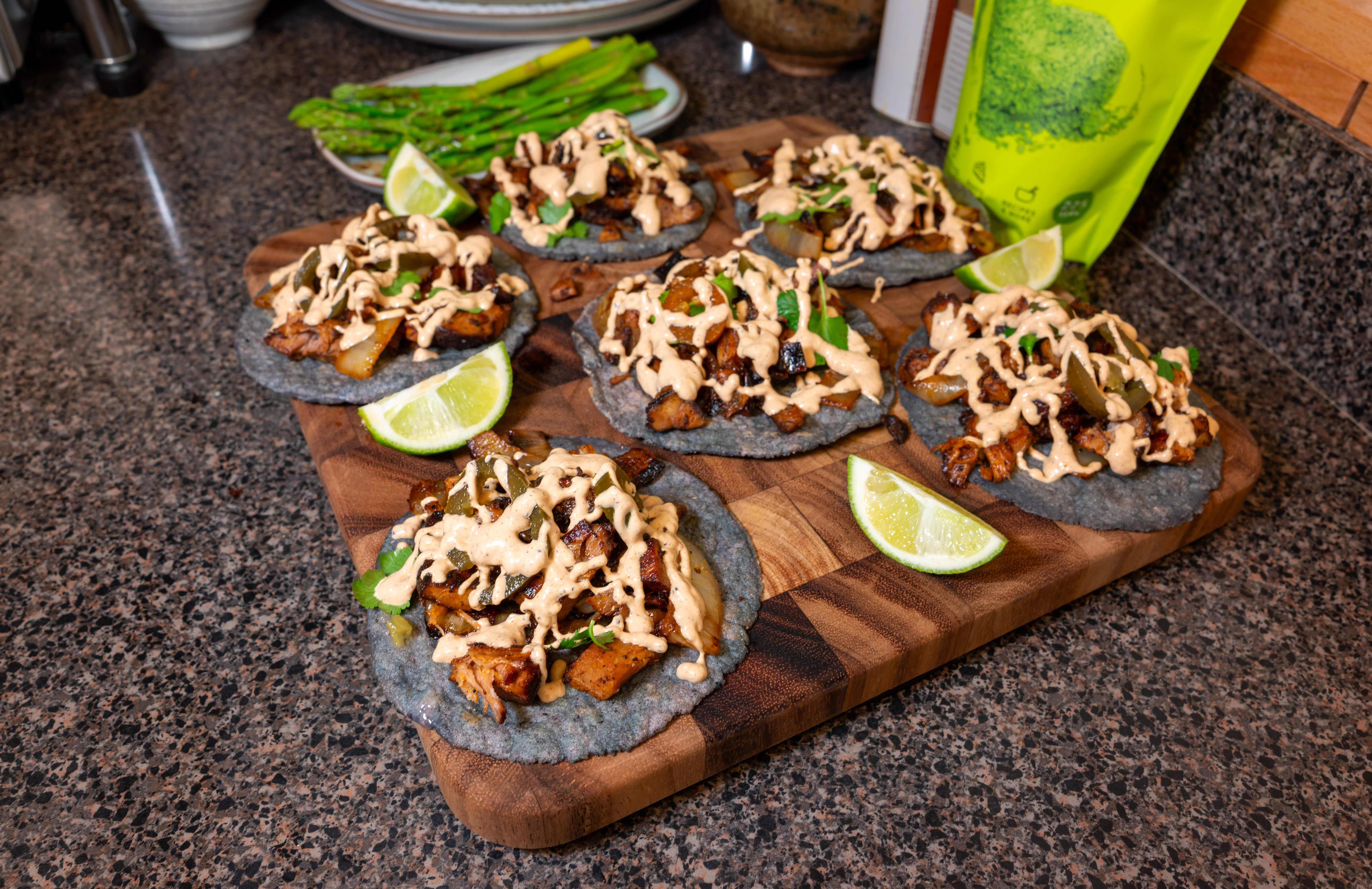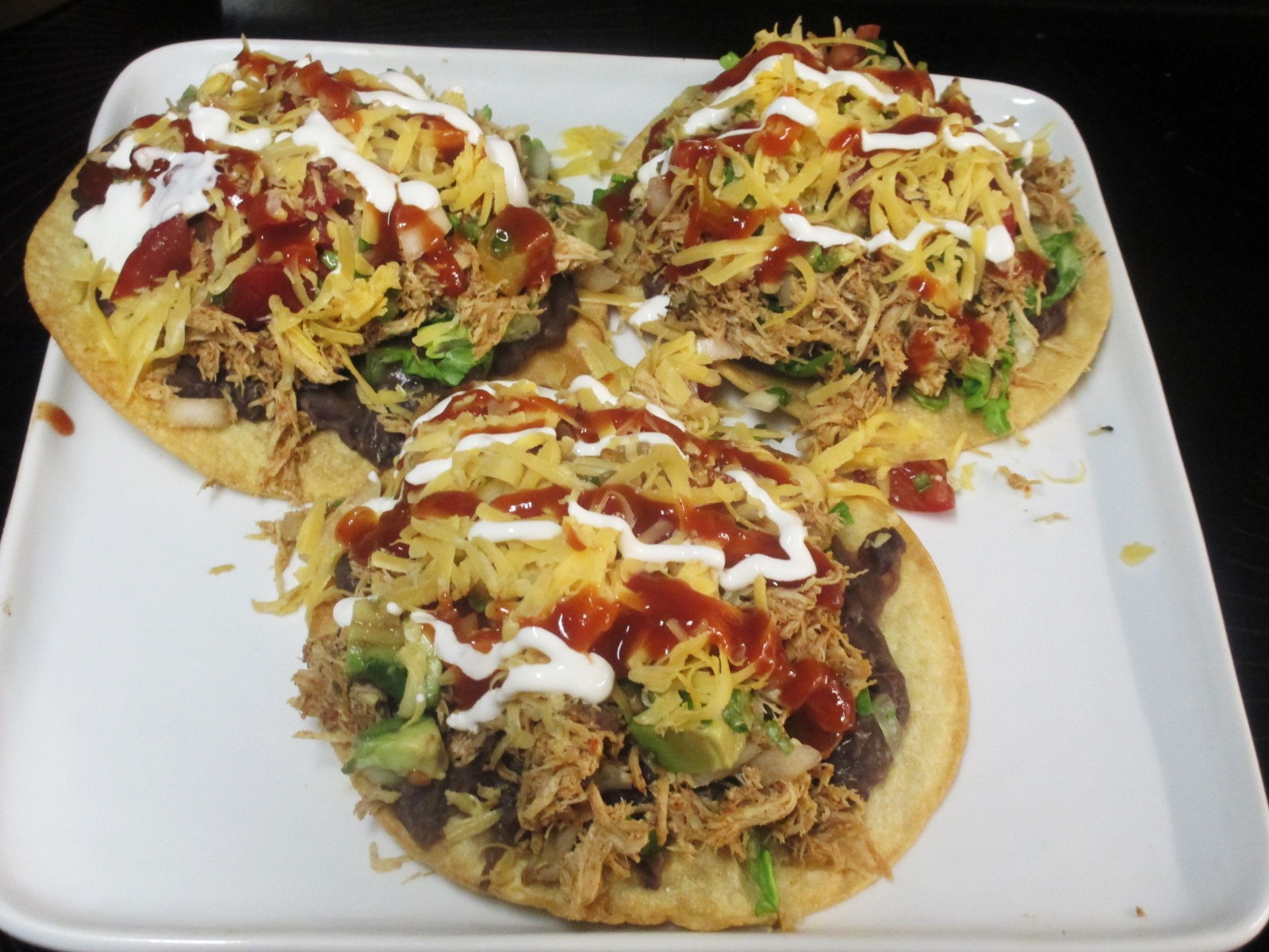 Piled too high seasoned, shredded chicken tostadas. Refried black beans, lettuce, pico with avocado, xsharp cheddar, taco sauce and sour cream. I’m stuffed.