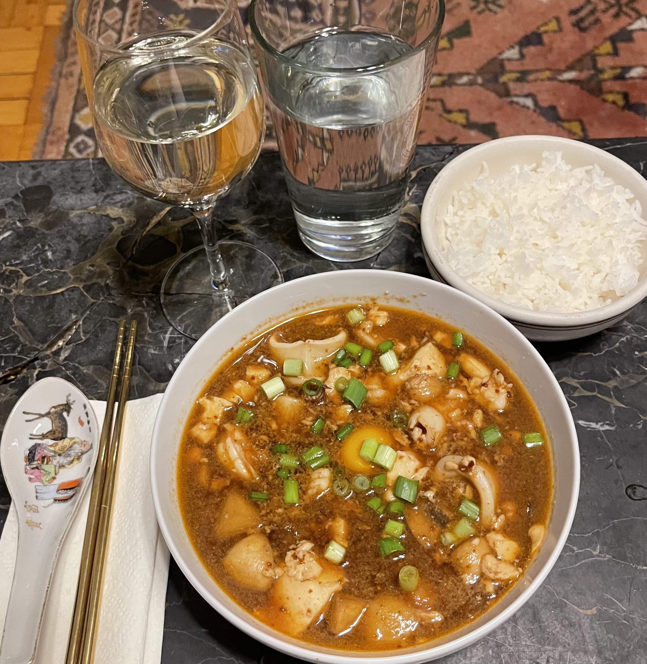 Soondubu jigae with the silken tofu I got from TJ’s, which was okay. Soft tofu would have worked better, and that’s on me. Also, I made too much, so I ate too much, and now I’m too full. Mood: surly.