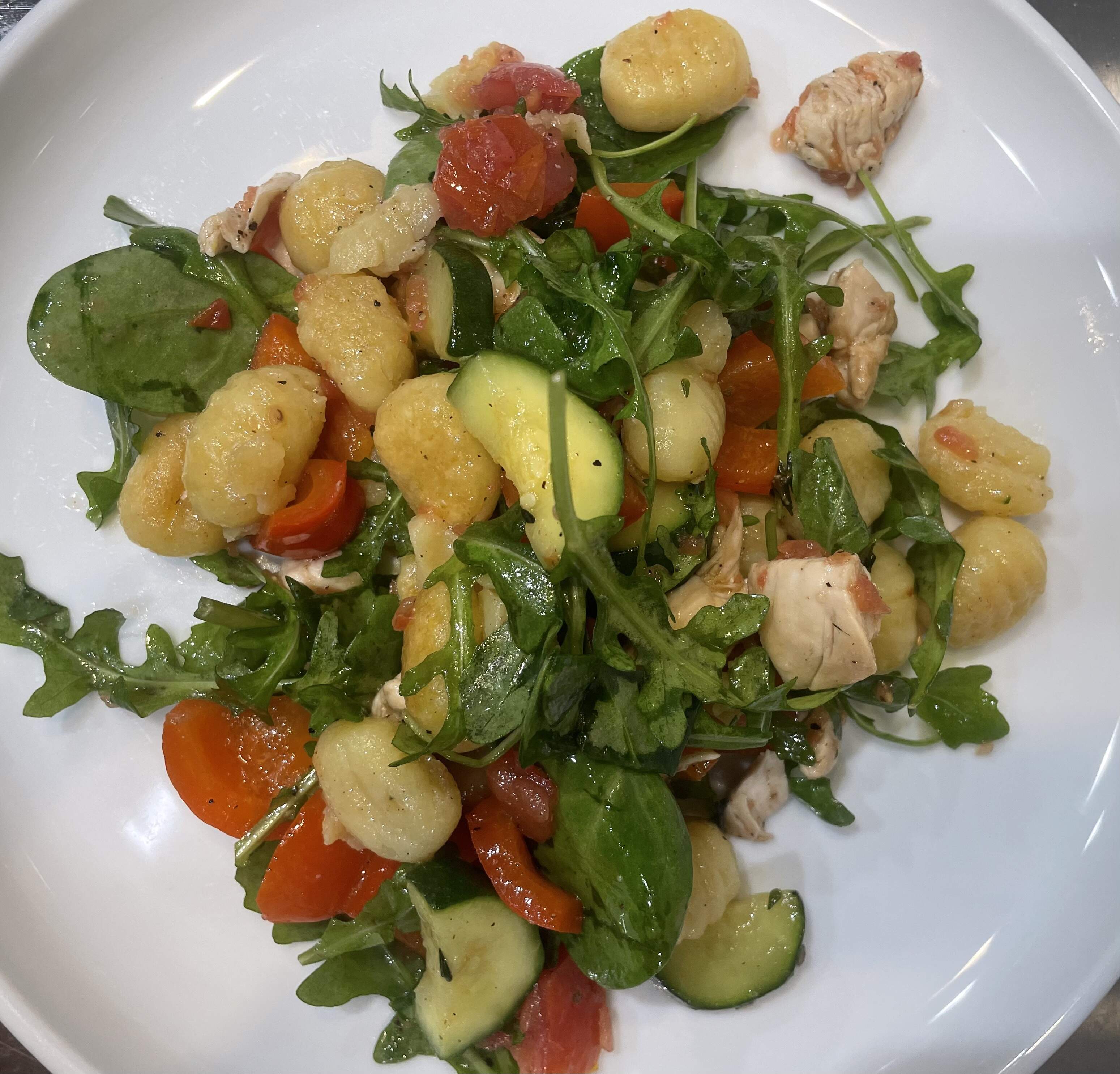 Gnocchi Salad with Vegetables and Chicken from a German cooking magazine - several components made separately and than mixed together in the end. Gnocchi are pan-fried until slightly crisp. Diced zucchini and red bell peppers are sautéed with garlic and thyme. Diced chicken breast is sautéed. Vinaigrette is made by grating tomatoes and mixing with white balsamic vinegar and a little bit of sugar. Everything is mixed with arugula and baby spinach