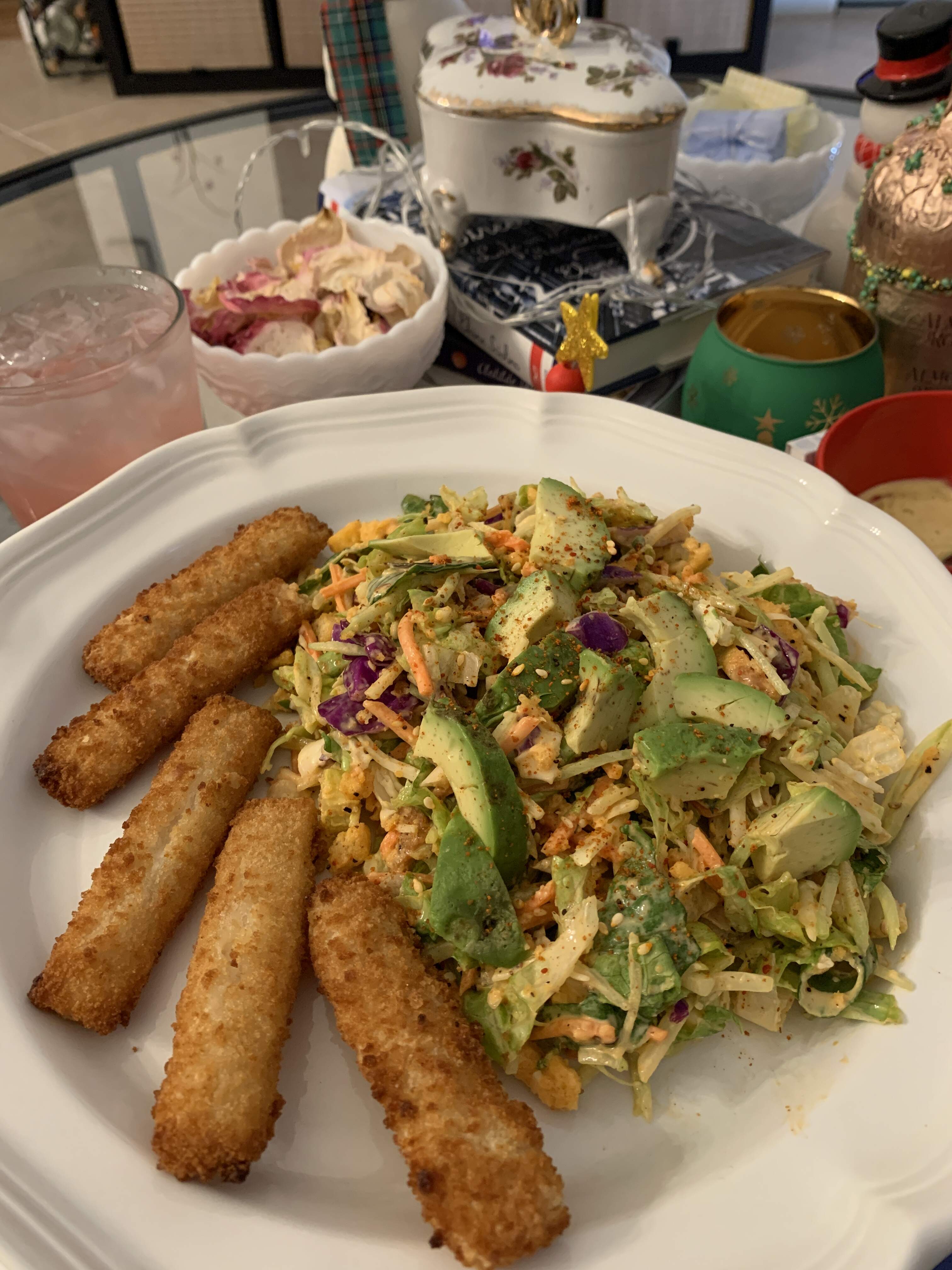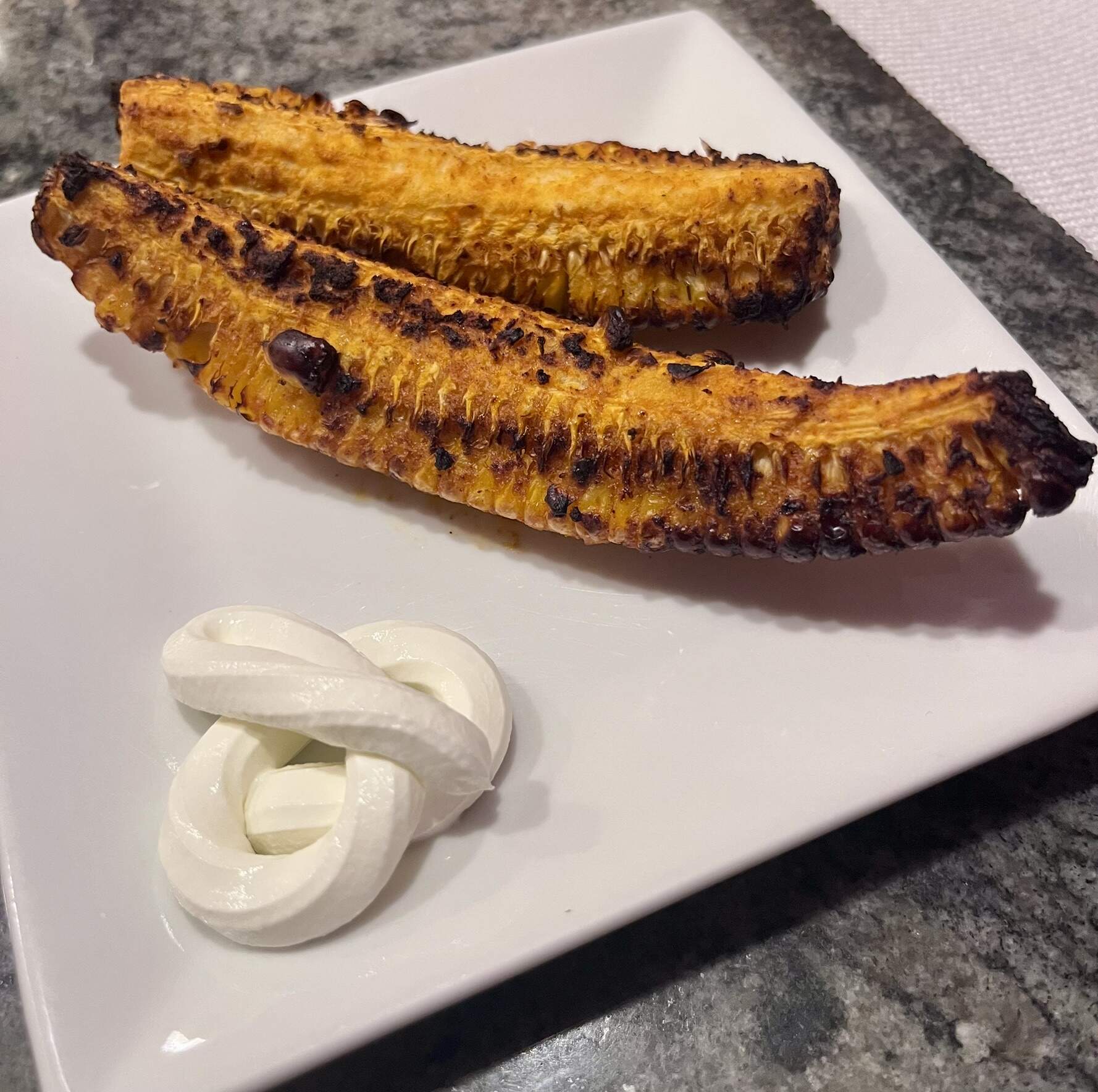 Dinner was another easy affair of chicken chile verde leftovers over rice, plus Aldi‘s chili lime corn ribs from the air fryer with a blob of sour cream on the side.