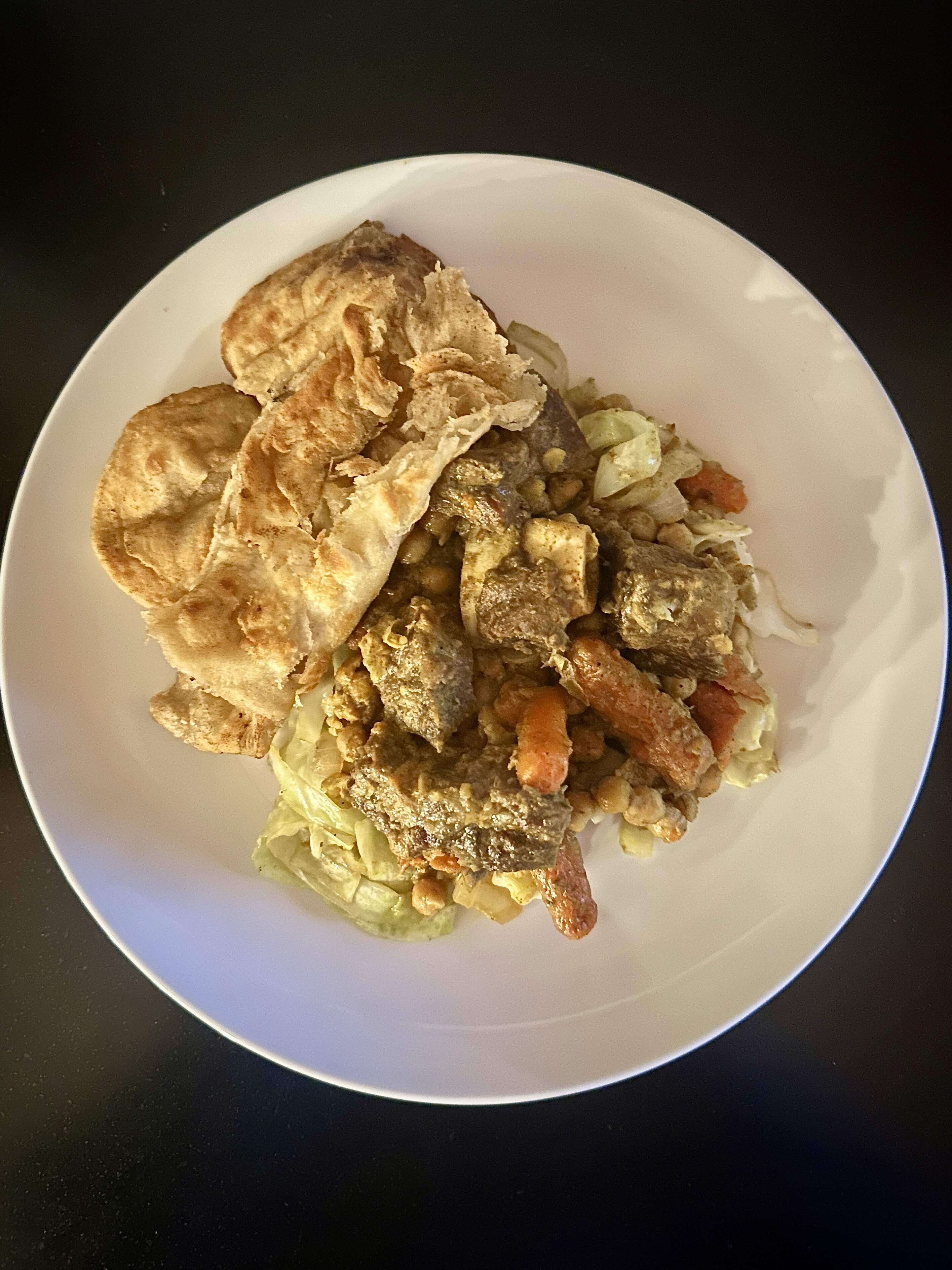 Mr Bean made Buss Up Shut. He loves busting it up part. Served sauteed cabbage.