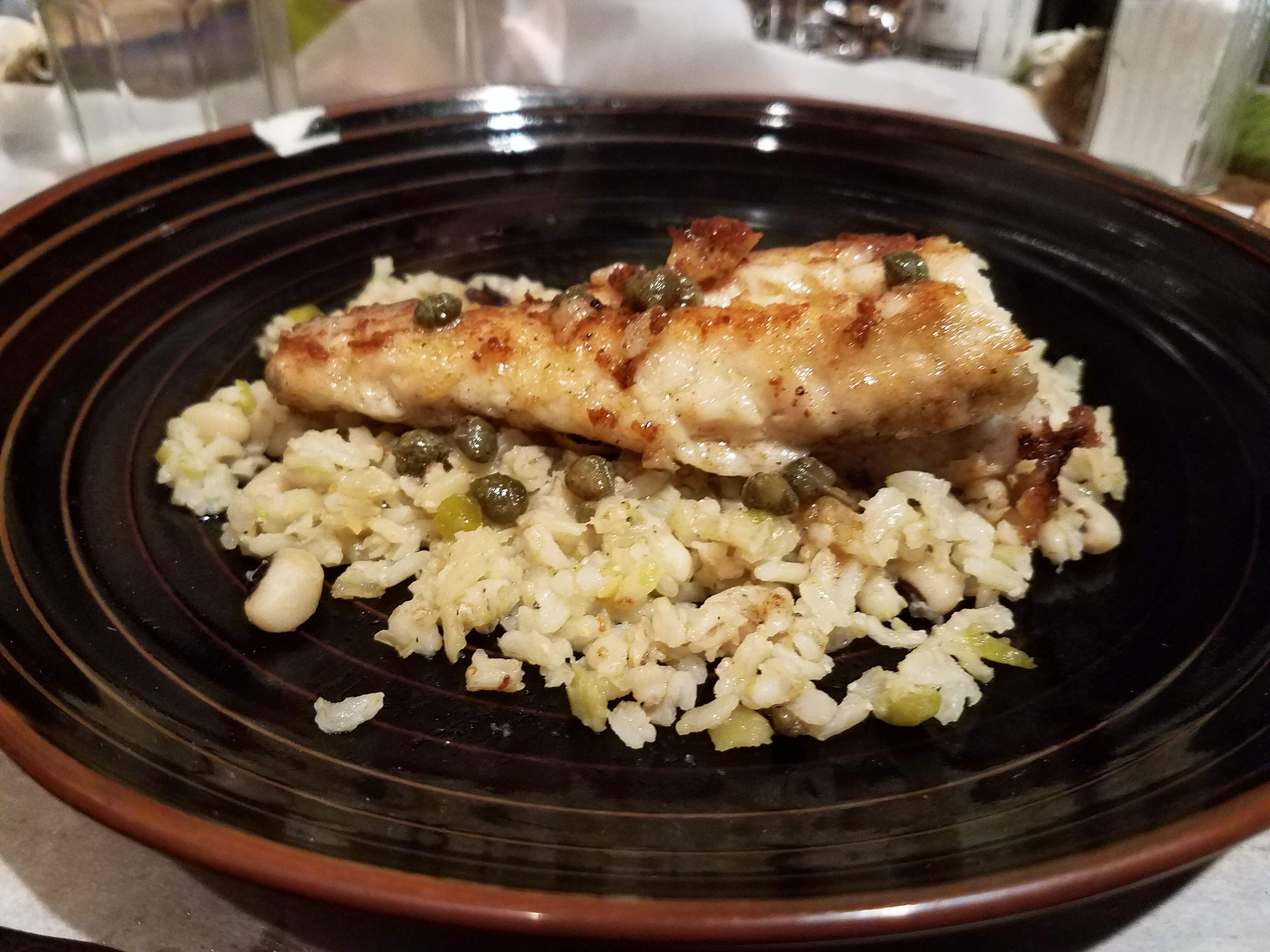 Somewhere around here people talked about monkfish, and the monger had some yesterday. Sauteed piccata style–brown butter, lemon, capers, garlic–on that brown rice and lentil pilaf from last night. I didn’t really like the texture. It’s said to be poor-man’s lobster, and it had that texture but not much flavor. But anything can work with brown butter, lemon, capers, and garlic, and this worked out fine.