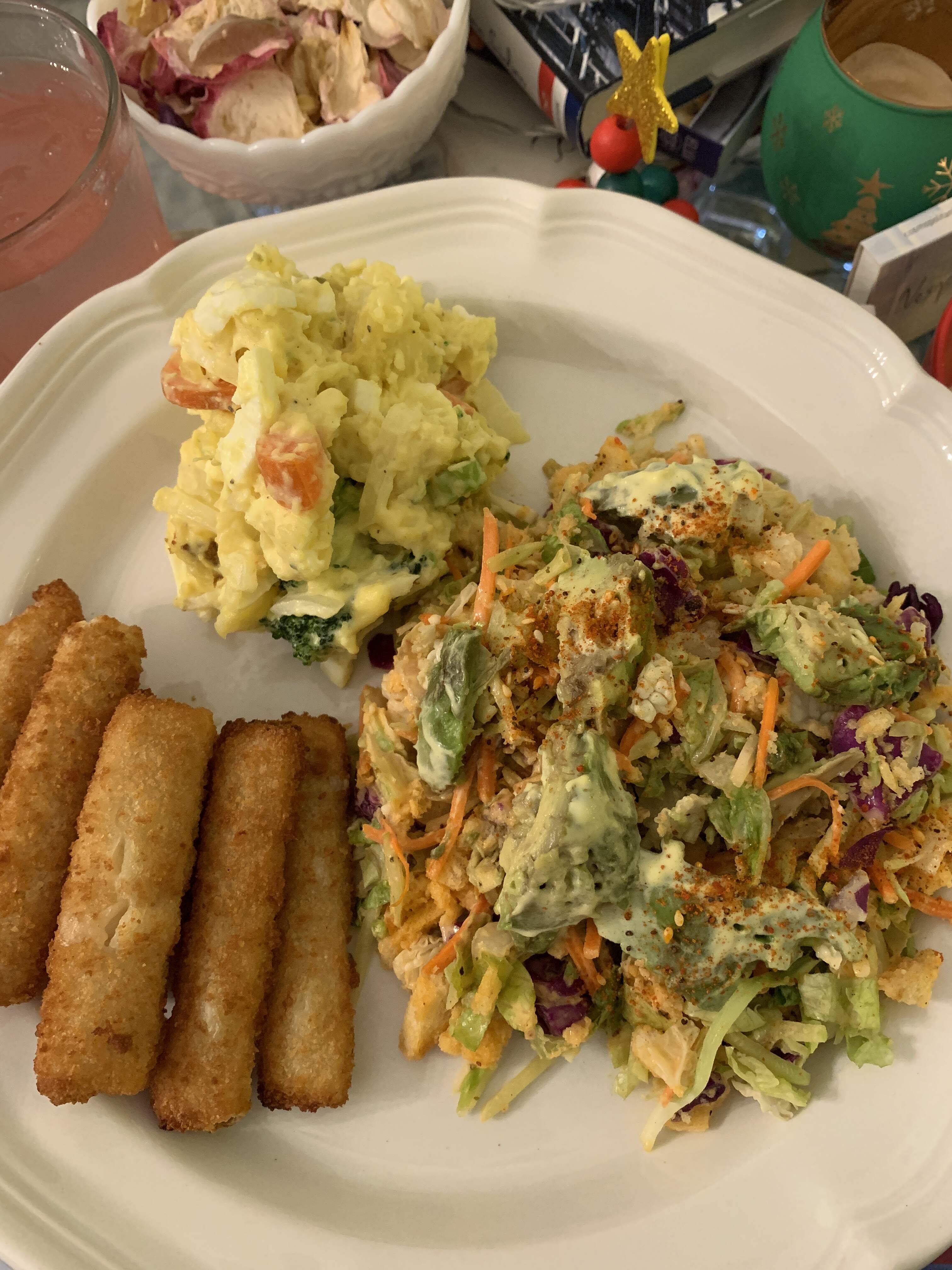 I enjoyed the salad and fish sticks with mustardy tartar yesterday so I had it again, adding the first potato salad of the year. Microwaved three similar sized russet potatoes and then peeled. Added celery, onion, and three hard boiled eggs. Dressing was rice vinegar while potatoes were still hot and then mayo, yellow mustard, and sweet pickle relish. Also added carrot, cauliflower, broccoli, radish, and salt and pepper. It was delicious and will be hard to beat.