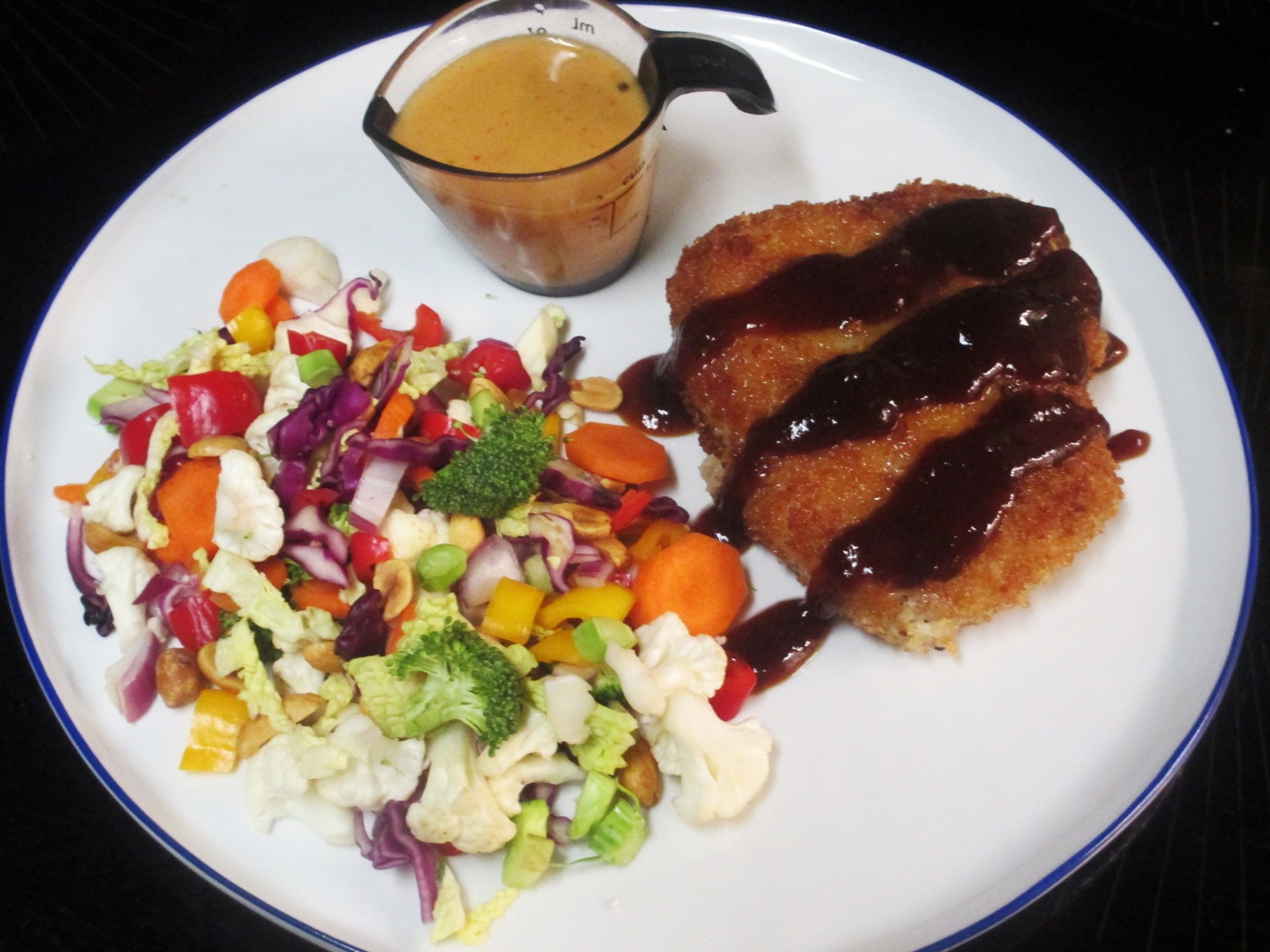 Brined pork chop, tonkatsu style. Chopped salad, cauliflower, broccoli, carrot, red and yellow baby bell, cabbages, red onion, peanuts with the last of the mystery dressing, a splash of sweet chili sauce and a squeeze of kewpie.