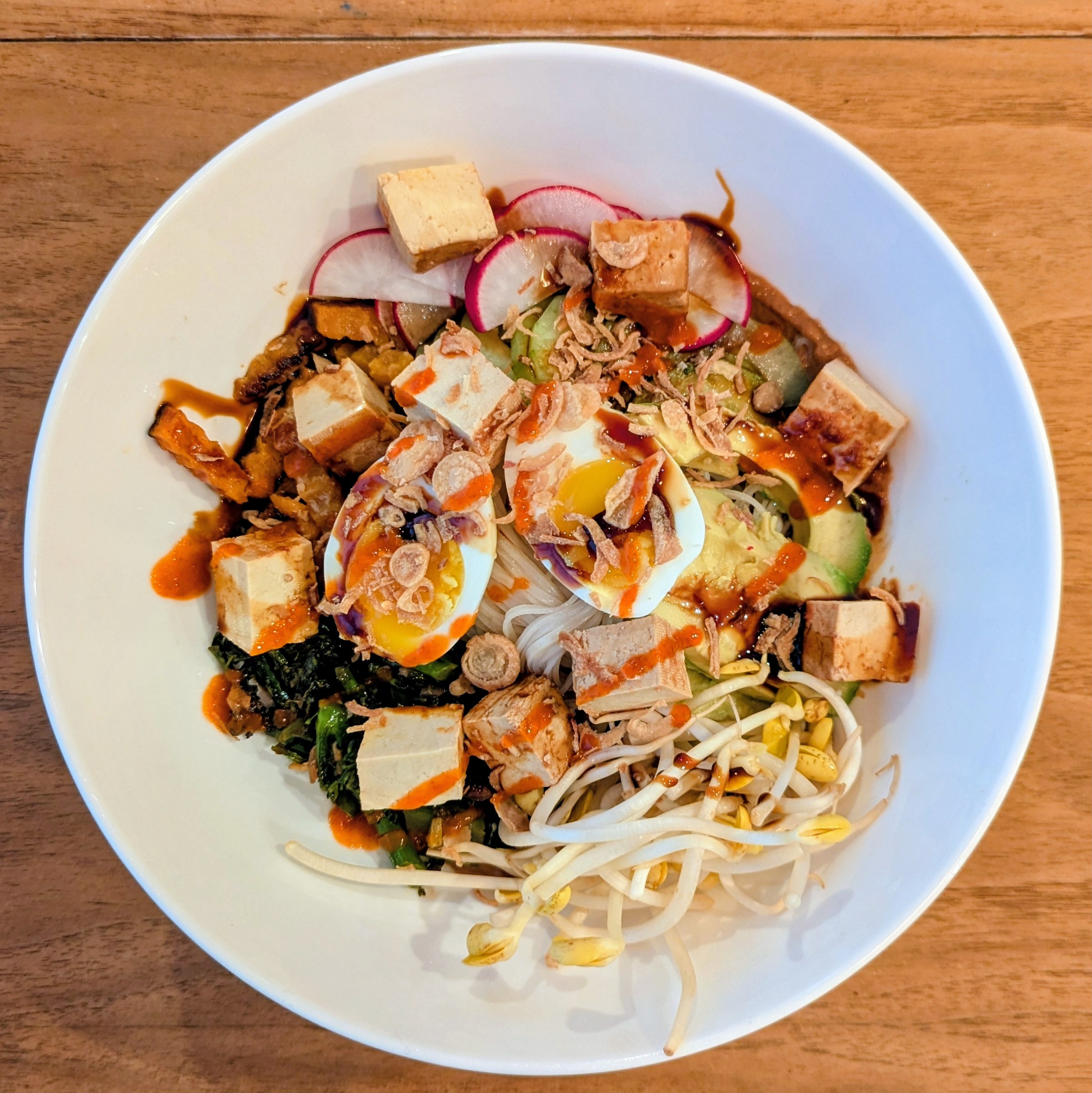 Tonight I made [Brown Rice] Vermicelli Tofu Salad With Peanut Sauce by Lara Lee. I omitted the edamame and added jammy egg, radish, stir-fried lemongrass green beans, garlic-soy broccolini, and leftover miso butternut squash. This was tasty! Nearly vegan.