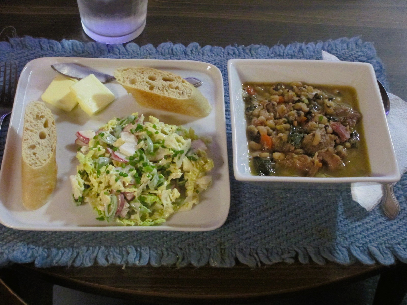 Black eyed peas, collards and ham from the freezer. Savoy cabbage, snap pea, radish salad, slaw dressing and chives. Warm buttered baguette.