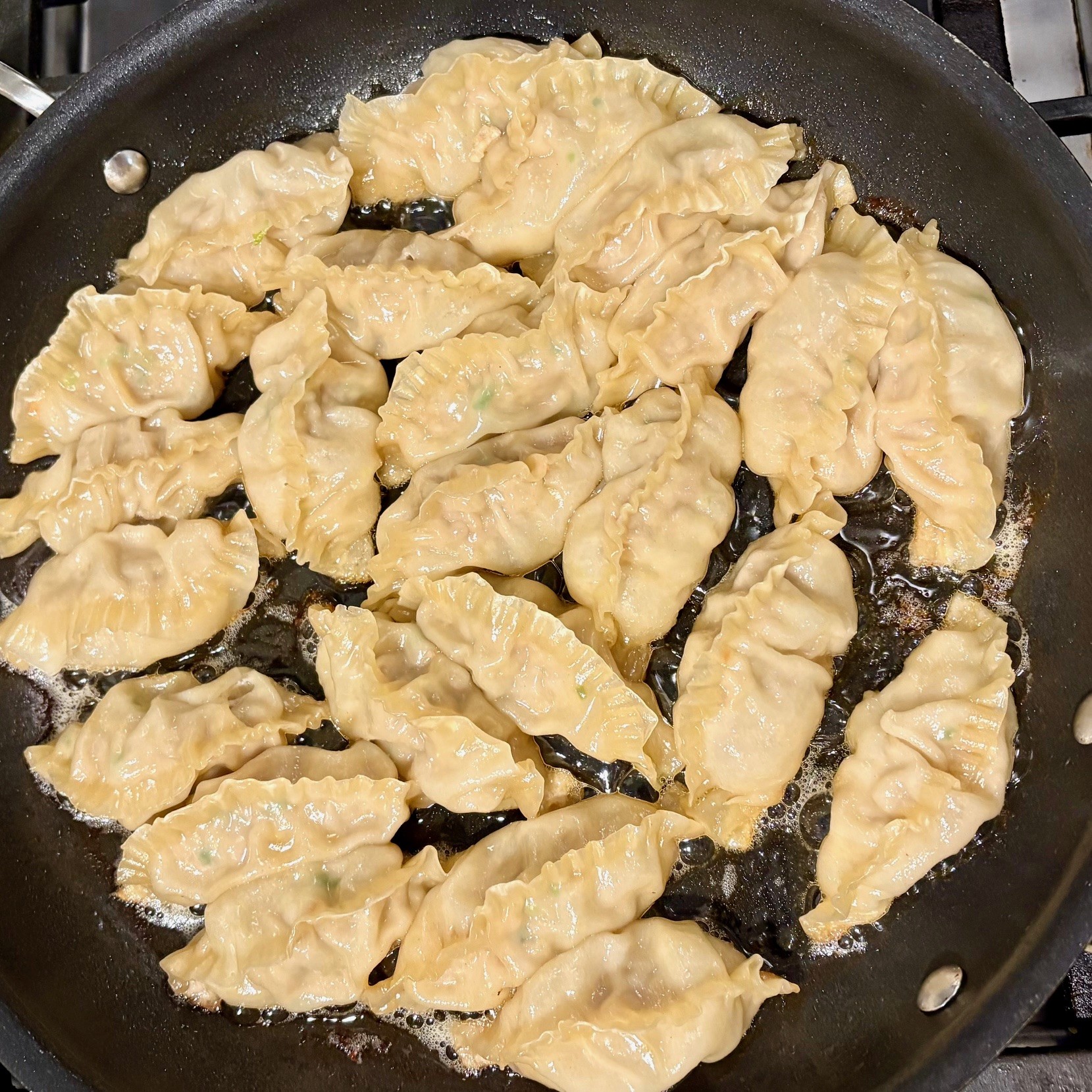 Pork and shrimp gyoza with scallions and water chestnuts (store-bough wrappers). Black vinegar dipping sauce. Steamed rice. Cucumber salad. Homemade chili crisp.