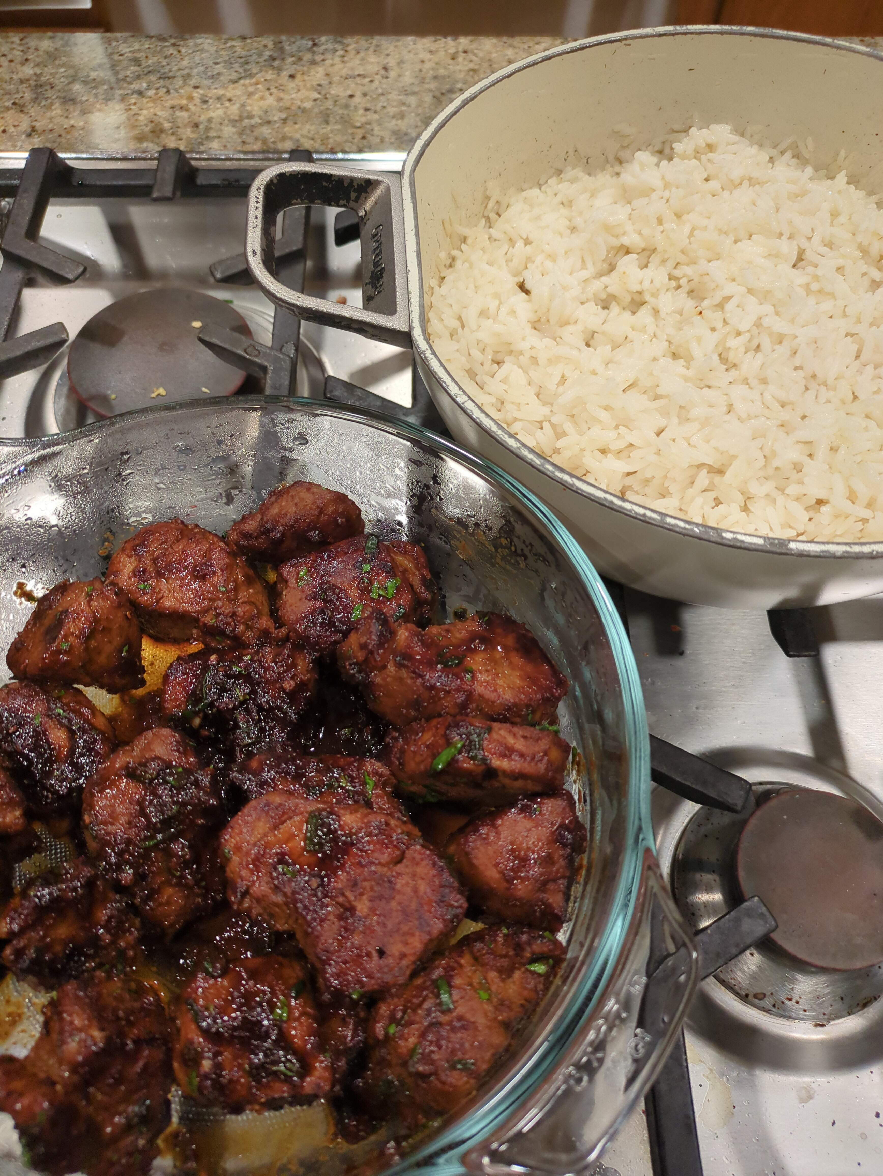 Harissa-Honey crusted pork tenderloin tenderloin bites…a mix-up of NYT and Milk Street Pinchos Morunos recipes