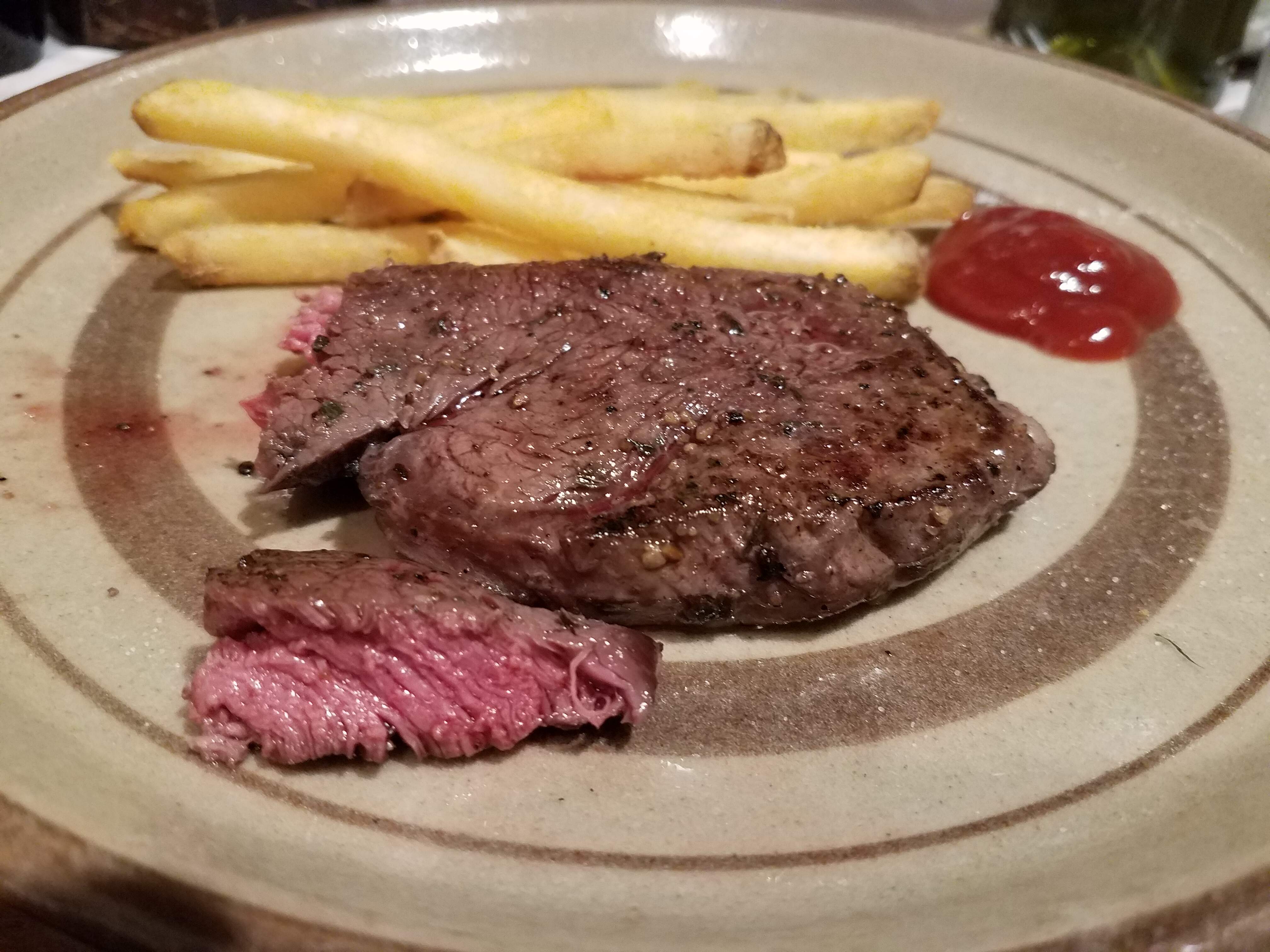 Steak-frites again, because I found a small beef tenderloin steak in the bargain bin, and because I finally found Lamb and Weston french fries here and wanted to try them. I don’t think I’ve had tenderloin steak before. Verdict: the tenderloin was very, um, tender, much more tender but not as beefy as the bavette I usually get. The fries were excellent, better than the recent McCain’s I’ve been getting.