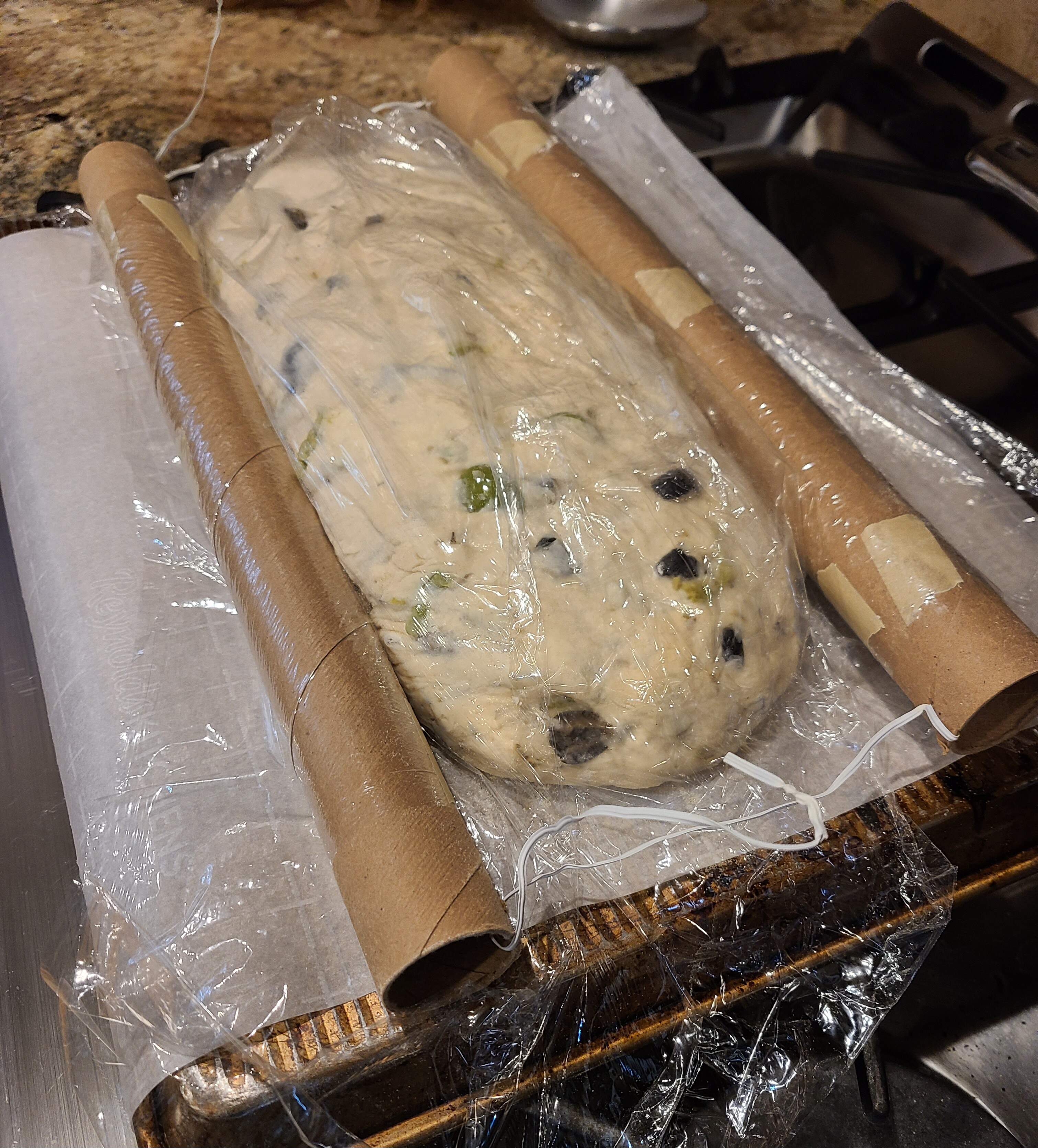 I’ve got this olive-garlic loaf rising at the moment. Very wet dough (83% hydration) and I wanted to get some more vertical out of it instead of it just smoodging(*) out to the sides.