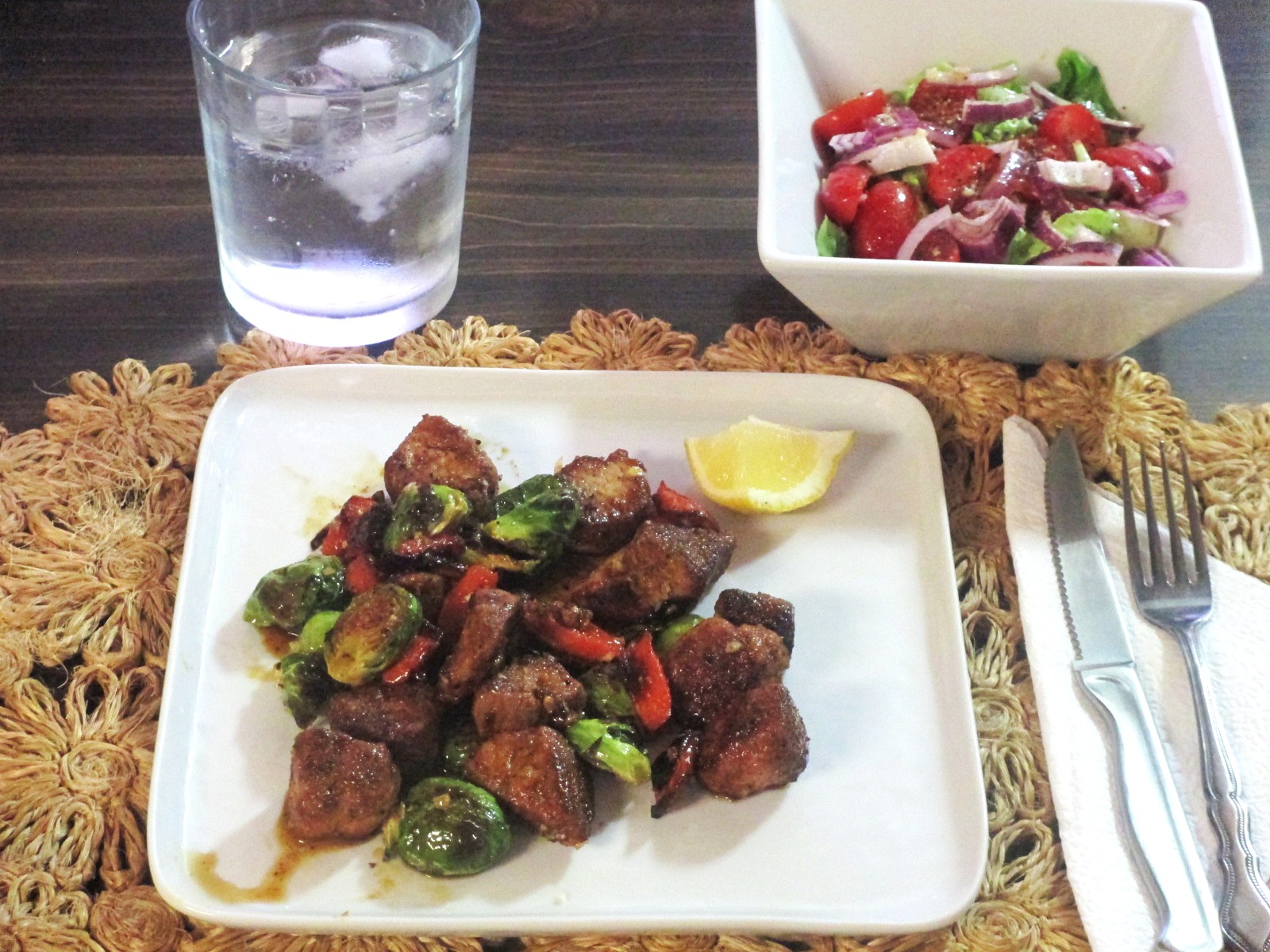 The discussion of pinchos morunos reminded of how much I like them. Added roasted brussels sprouts and carrots and poured the garlic honey lemon sauce over everything. Little gem, red onion, tomato salad, sherry vinegar &n oo dressing.