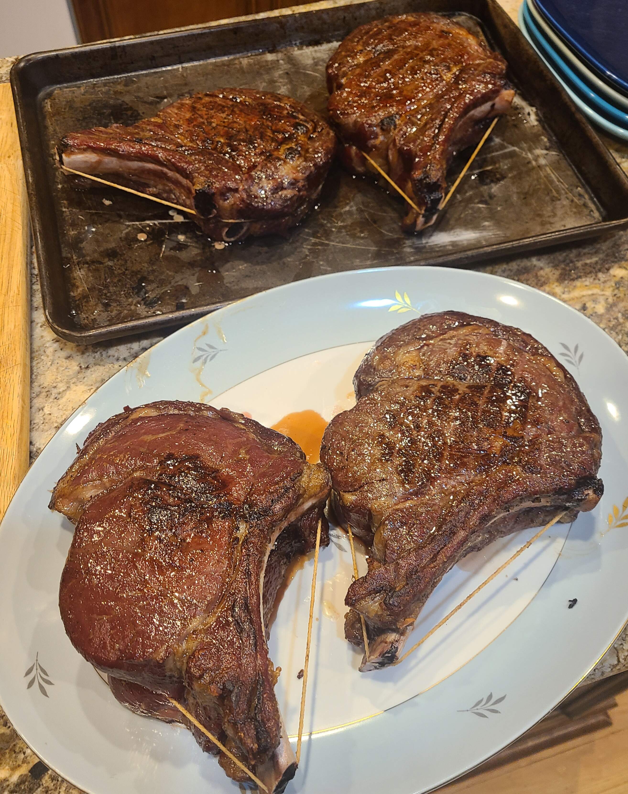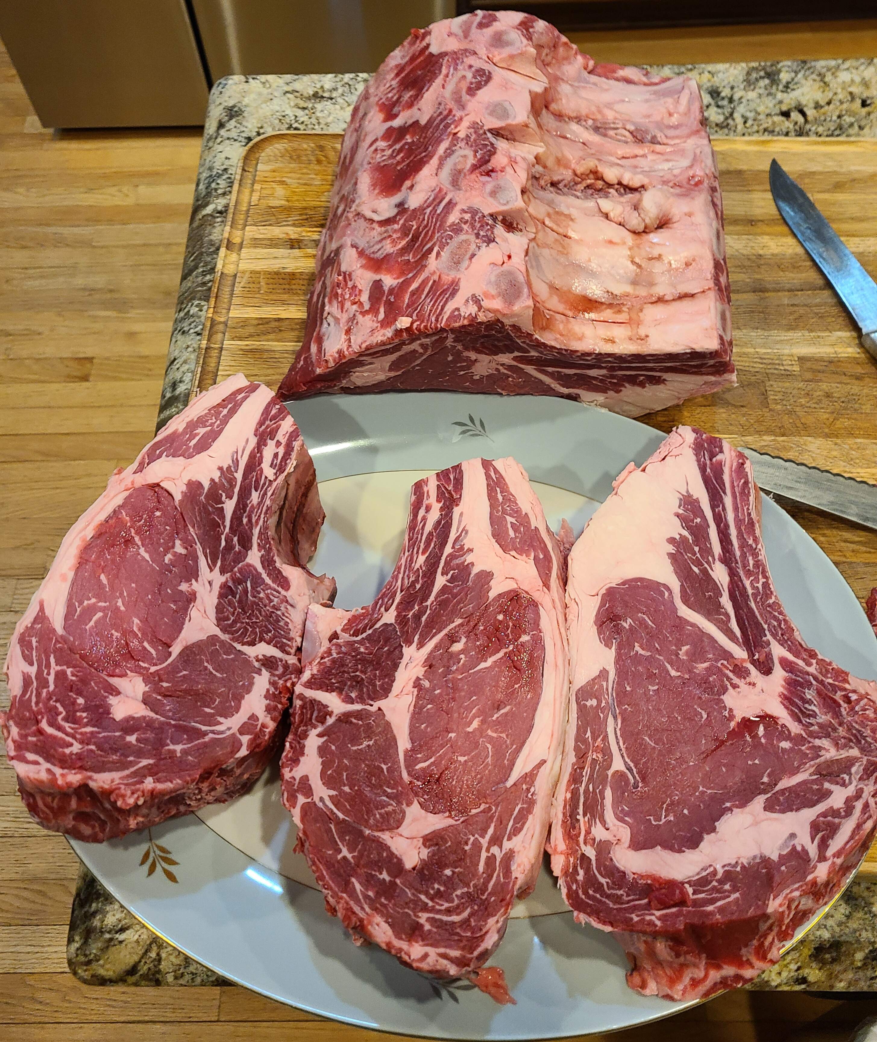My son-in-law was supposed to join us but due to a last minute planning change, his parents are visiting them this weekend. And 2 other guys who were tentative dropped out, so I sent 3 of the steaks home with the SIL, only minimally trimmed because some people like the extra fat down near the bone end. Average mass, 1318g (2.9 pounds):