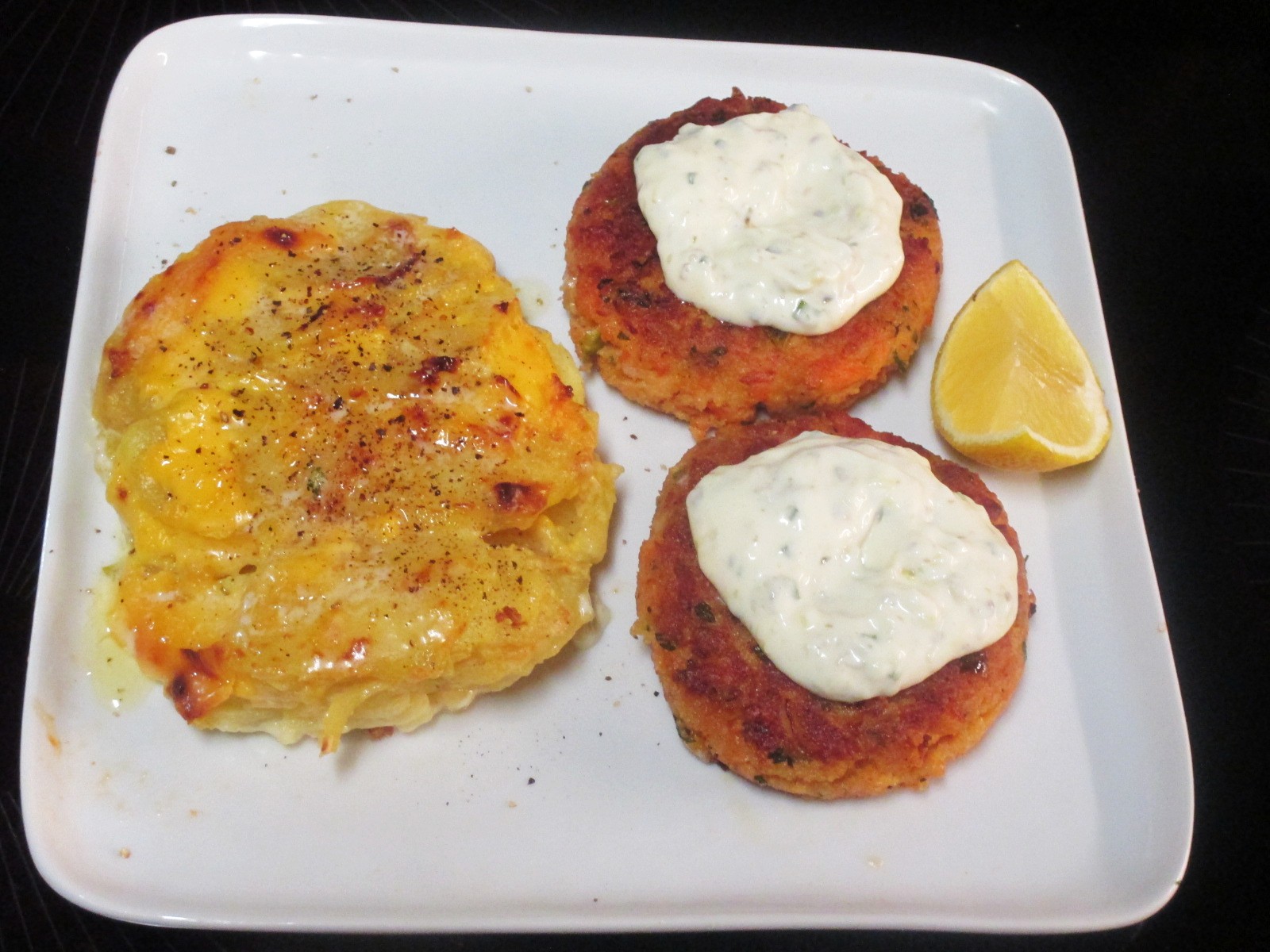 I defrosted the freezer yesterday, lots of small containers of leftovers. I got rid of 3 by making nyt salmon patties and my potatoes au gratin. Cabbages slaw, yellow baby bell, radish, oo & v dressing. Patties were tasty and moist. I used a salmon burger and pieces of sockeye, used less panko, figured they would soak up the juice as they rested and they did.