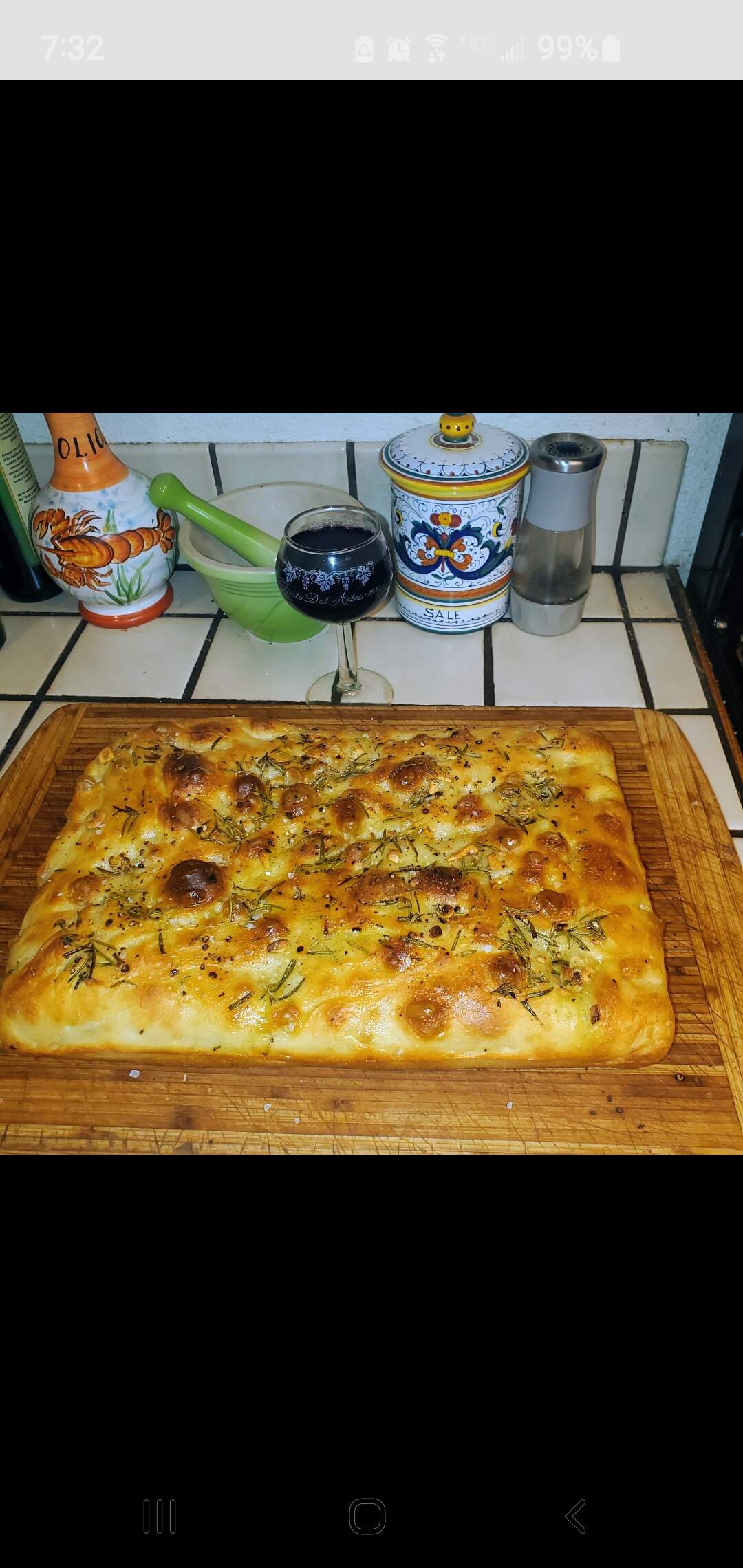Saturday focaccia. I liked the way this one turned out .Garlic and Rosemary . Soft and crunchy. Served with smoked pork loin , potatoes, and salad. Cheers.