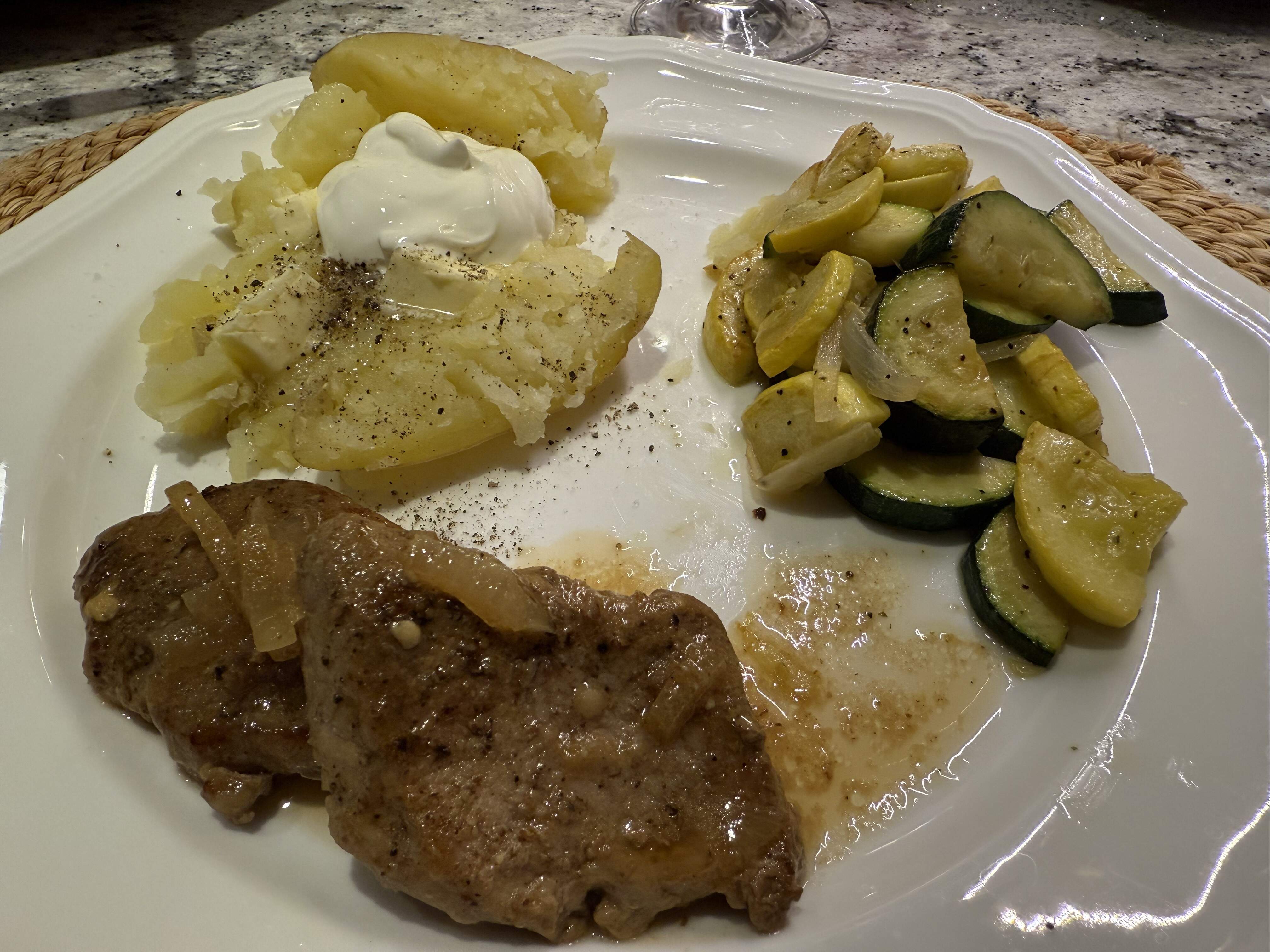 Last night’s dinner: pork medallions with shallot, balsamic vinegar, and Dijon mustard. Small baked potato with the basic fixings, and sautéed zucchini and yellow summer squash.