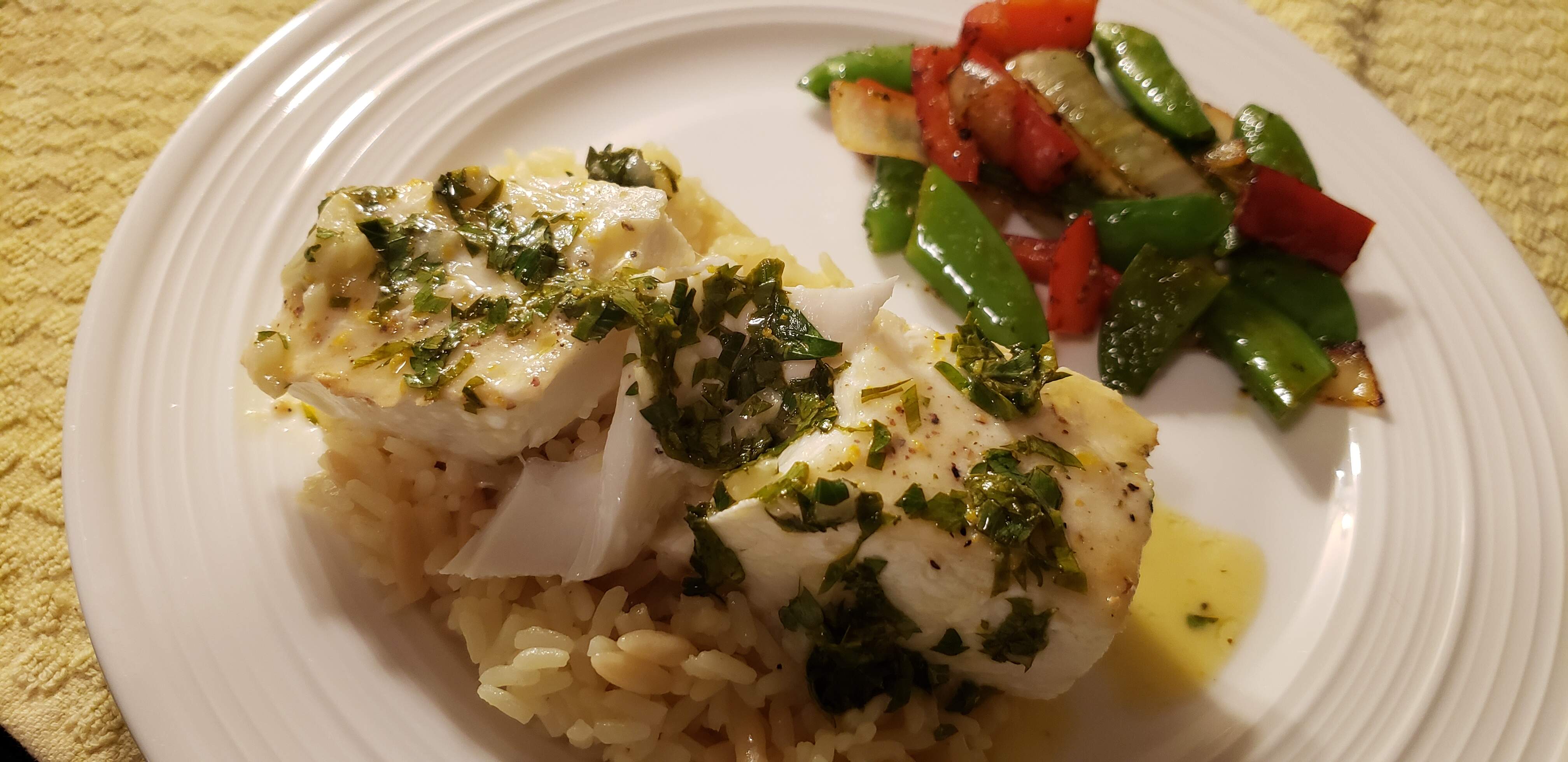 A white wine-lemon-parsley sauce was made to drizzle on the fish, served on Near East rice pilaf with sautéed sugar snap peas, red bell pepper, and onions alongside with Tuscan Sunset seasoning blend and a bit of s/p.