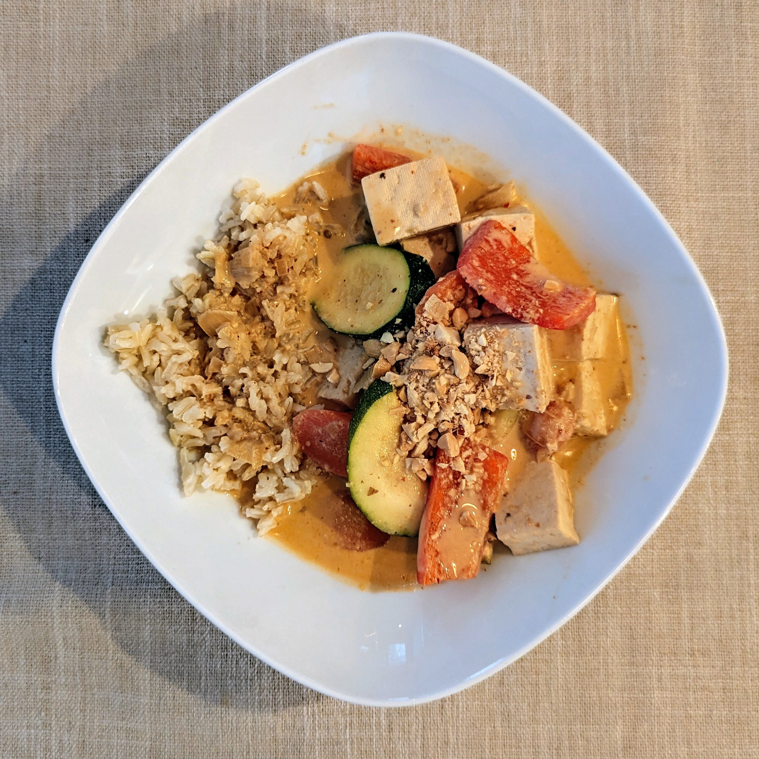 I made Penang curry with tofu, red pepper, zucchini, and carrot over brown rice. Did my usual combo of coconut milk with Mae Ploy paste, shallot, lemongrass paste, Makrut lime leaf, coconut sugar, fish sauce, Golden Mountain sauce, soy sauce, and a little veggie broth. Garnished with lime wedges and chopped peanuts.