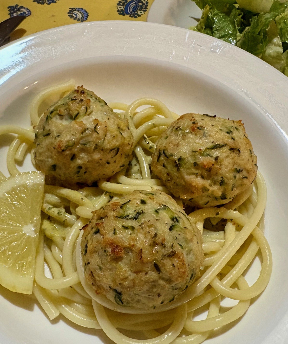 Roasted chicken-zucchini-parm meatballs, served with a creamy basil pesto sauce (I added red pepper flakes). Bucatini noodz. Romaine in Caesar dressing. Easy and satisfying, will make the pesto sauce again.