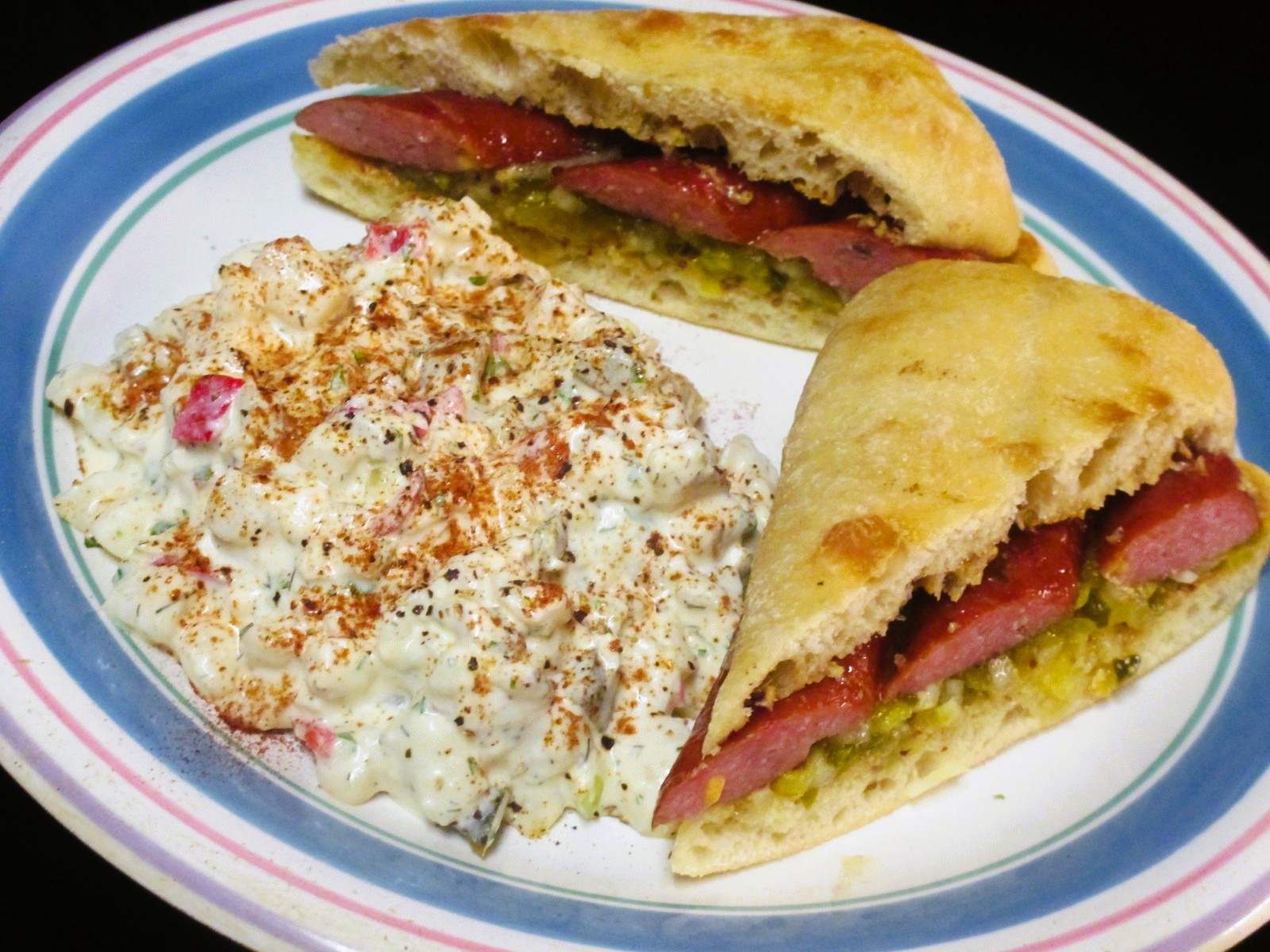 Needed something that would thaw fast and cook fast. Grilled jalapeño, cheddar sausages, onion, pickle relish and mustard on a French sandwich roll. Left over potato salad. Mexican coke.