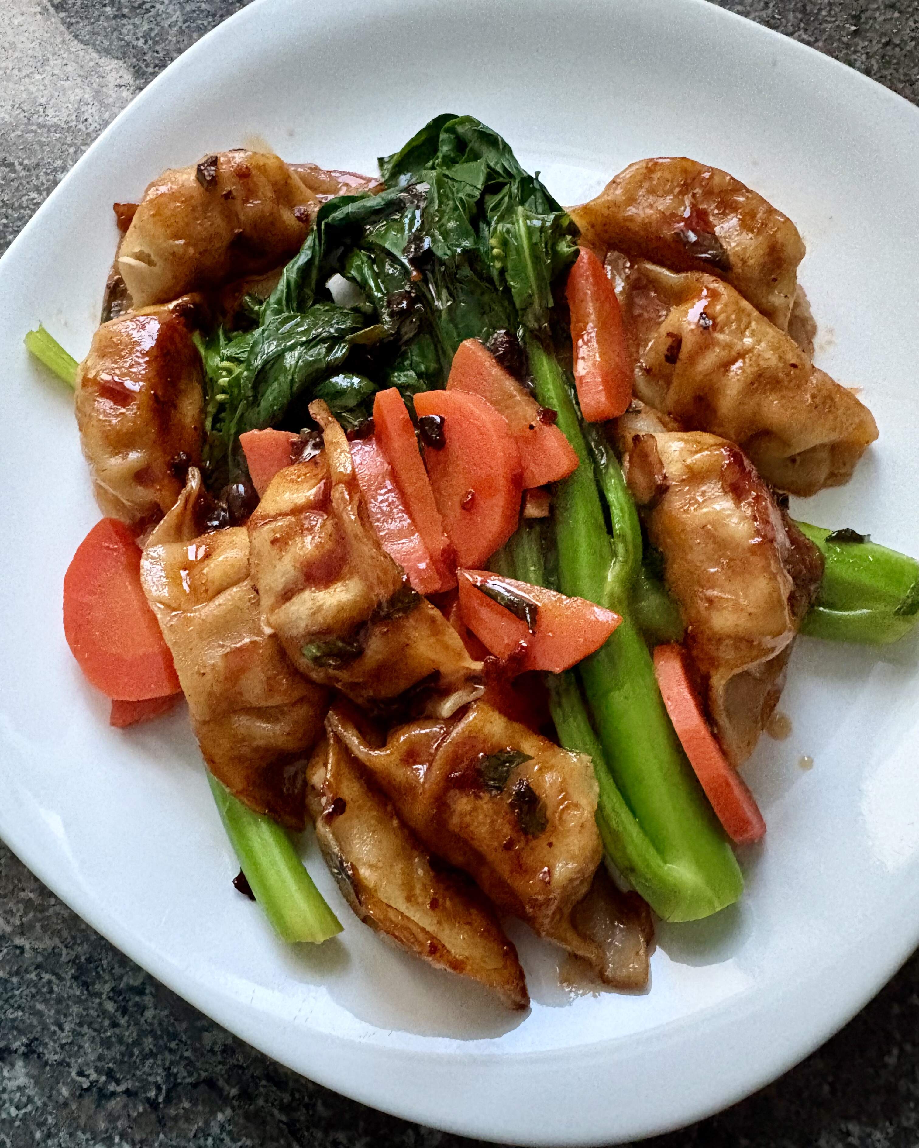 Felt like something a little Asian-y tonight. Pan fried pork and ginger dumplings with gai lan and carrots. Everything splashed with my secret Asian-y sauce..