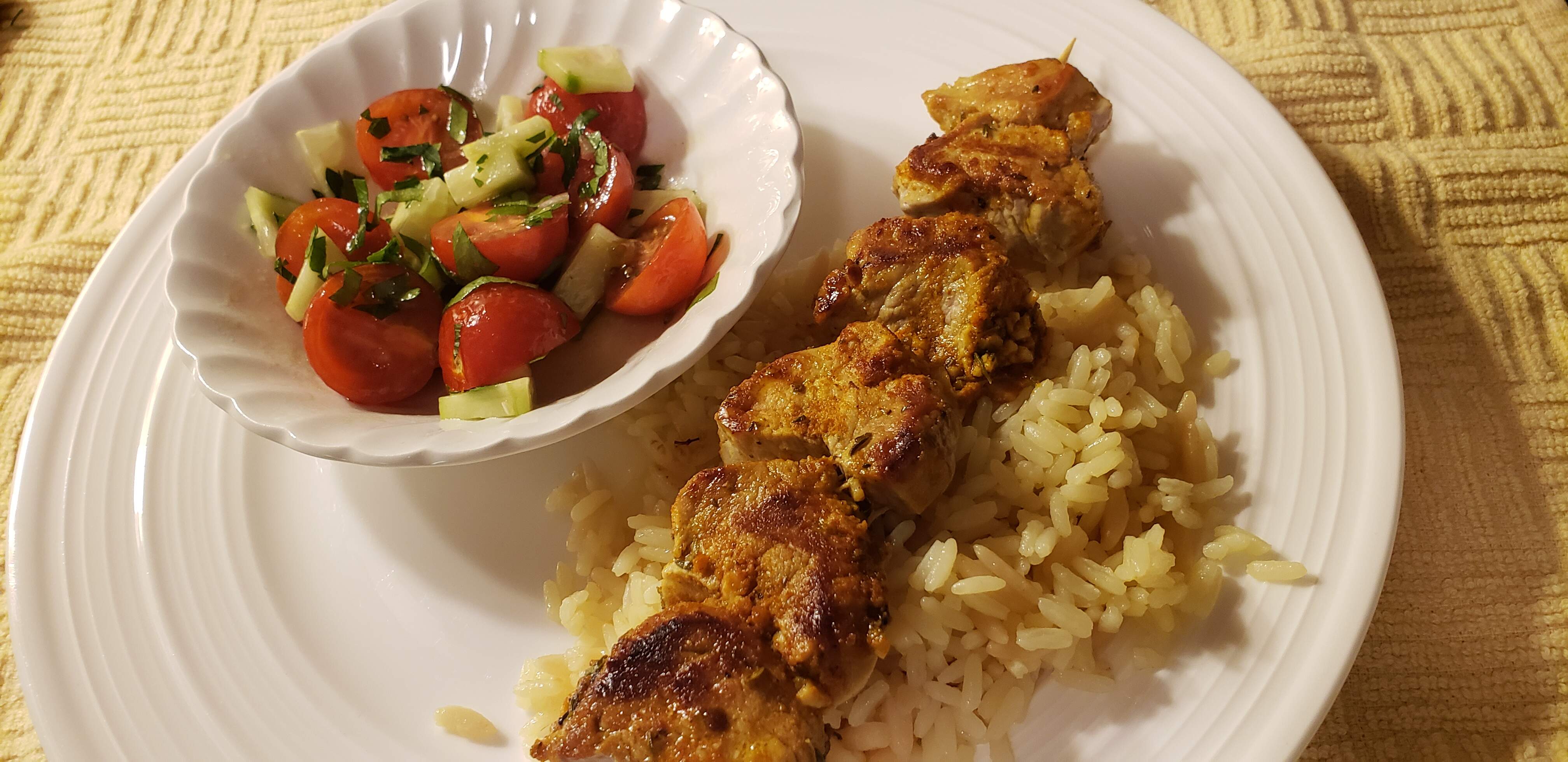 Served on leftover rice pilaf with a tomato-cucumber-parsley salad with sherry vinegar dressing alongside.