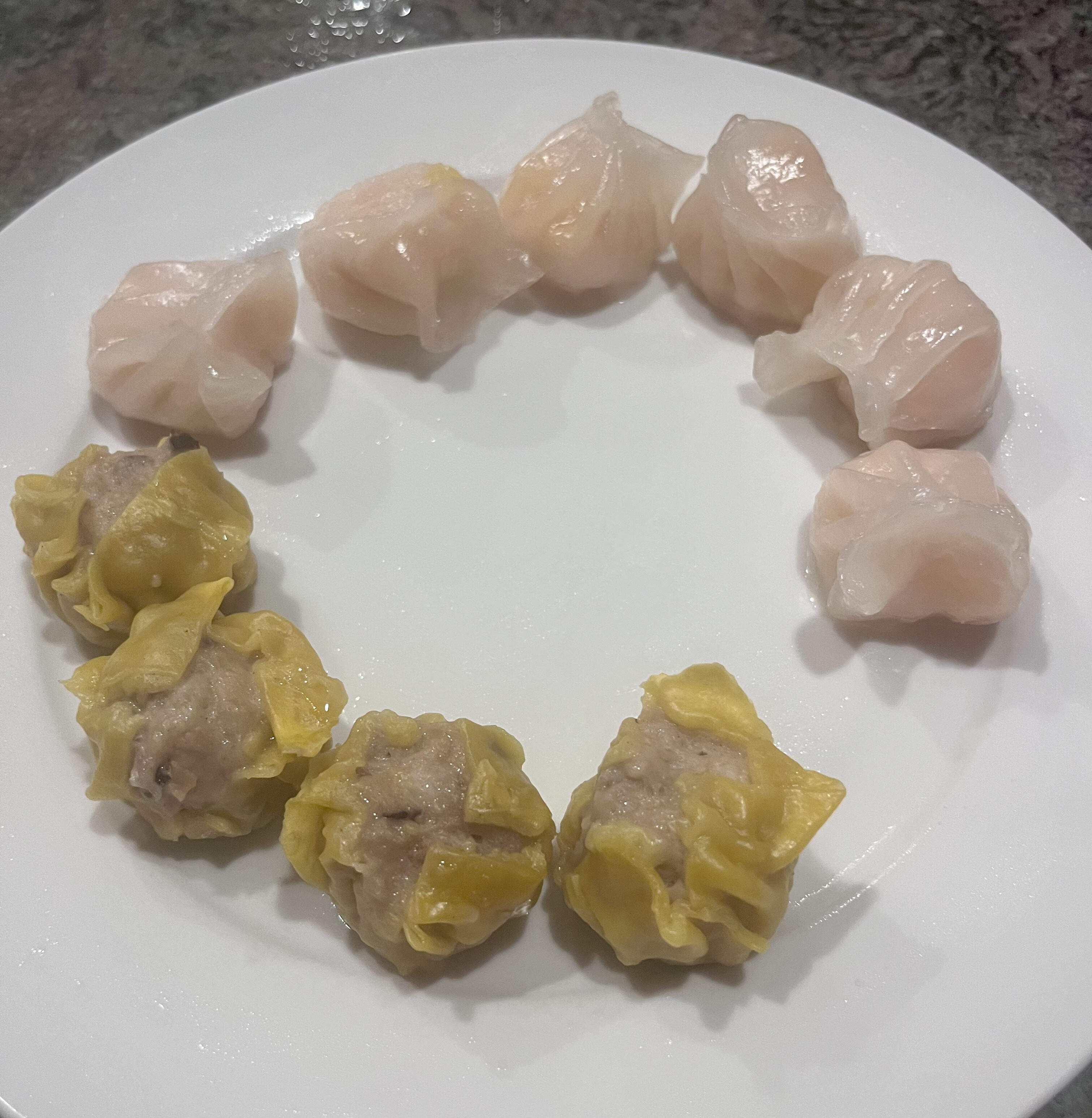 As for tonight, simples: an assortment of steamed domplings from the freezer, i.e. 3 har gow, 2 pork & shrimp shumai, and 3 pork & leek dumplings each. Easy dippin’ sawce with the last of the Sinatra. The har gow weren’t the best brand we’ve had, but the “supreme” shumai will def be a repeat purchase.