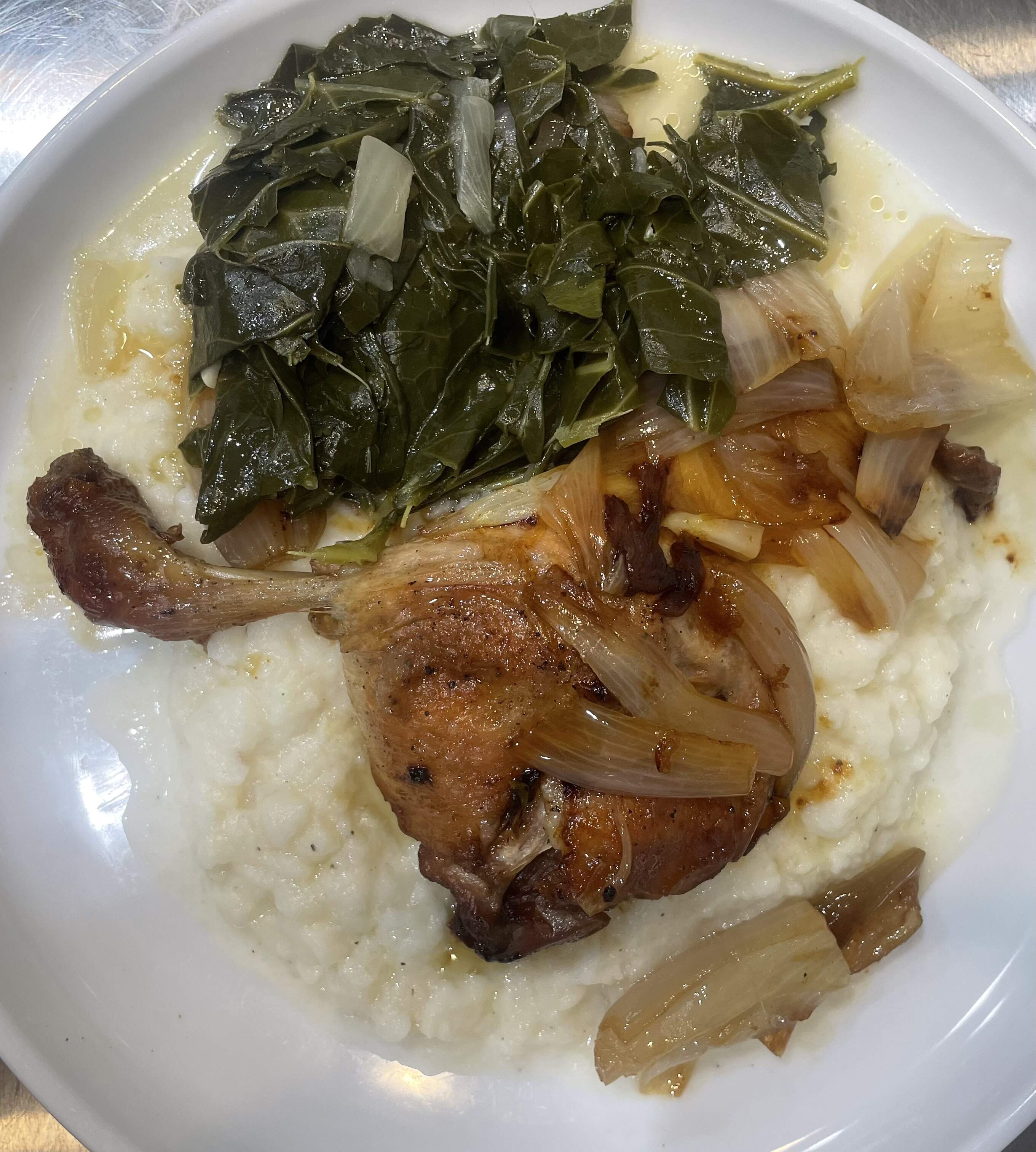 Braised Duck Leg with Celeriac-Potato Mash (German cookbook) and Long-Simmered Collard Greens (Saveur cookbook) - the duck legs are braised in the oven, first alone than after 45 minutes plenty of shallots, rosemary and bit of honey are added and braised for another hour. At the same time, you braise the collard greens with onions and garlic for one hour hour in chicken broth. Served with celeriac-potato mash, made with milk, cream and nutmeg