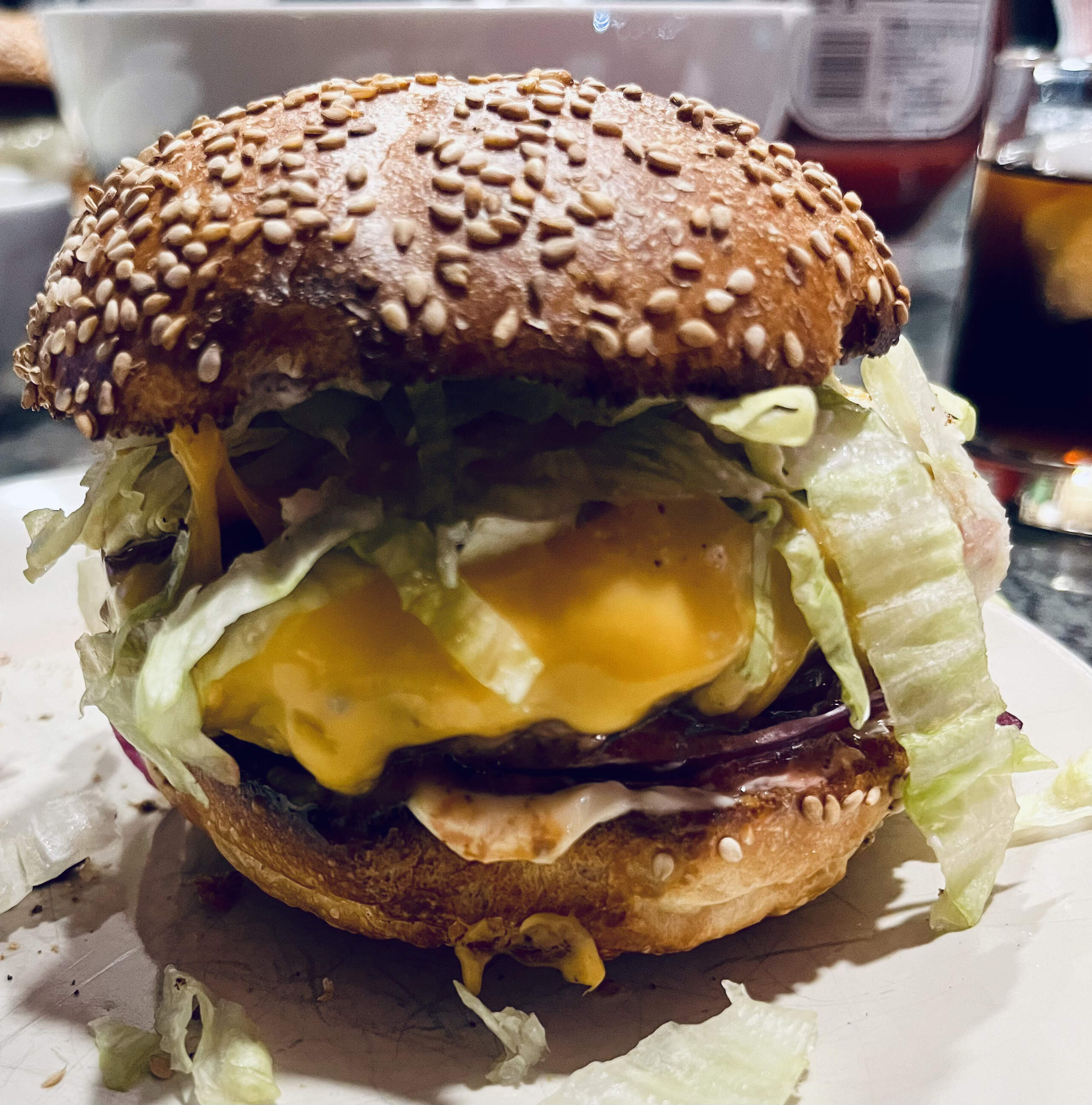 , more health food was in order @casa lingua tonight: cheeborgerz n fries. The usual TJ’s chuck / brisket / sirloin patties pan-fried MR, topped with Wegmans’ ultra sharp ‘murrcan cheez on Wegmans’ sesame seed Kaiser rolls. Shmear of Duke’s & Heinz for me, Heinz & mustard for him, shredded iceberg & thick-sliced red onion for both of us. I’d forgotten that we had to get rid of the Grillo’s pickles, so we had to do without. Sadz.