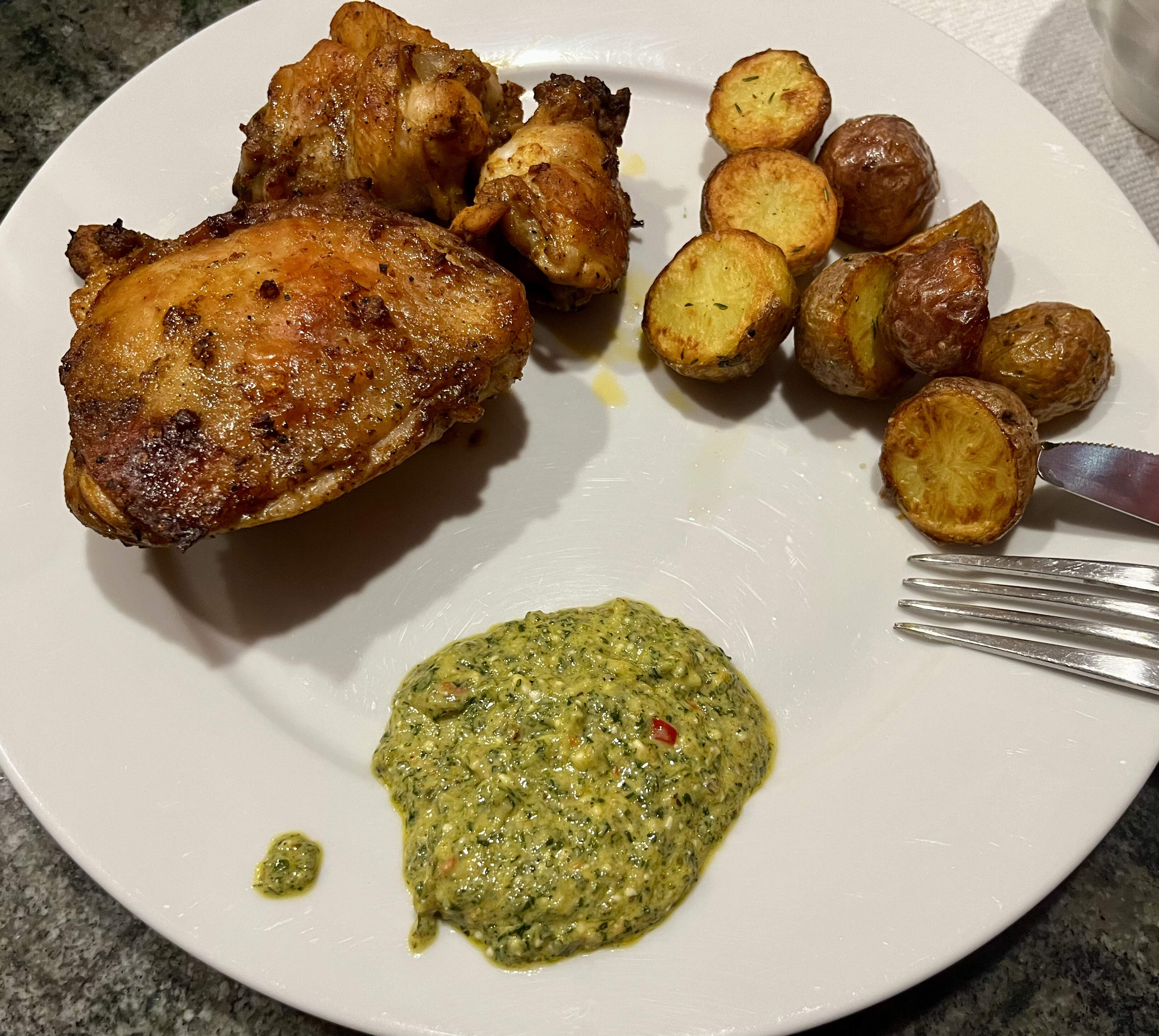 I’ve been looking forward to tonight’s dinner since I begged my PIC to make it for us a few days ago: Peruvian chicken with aji verde