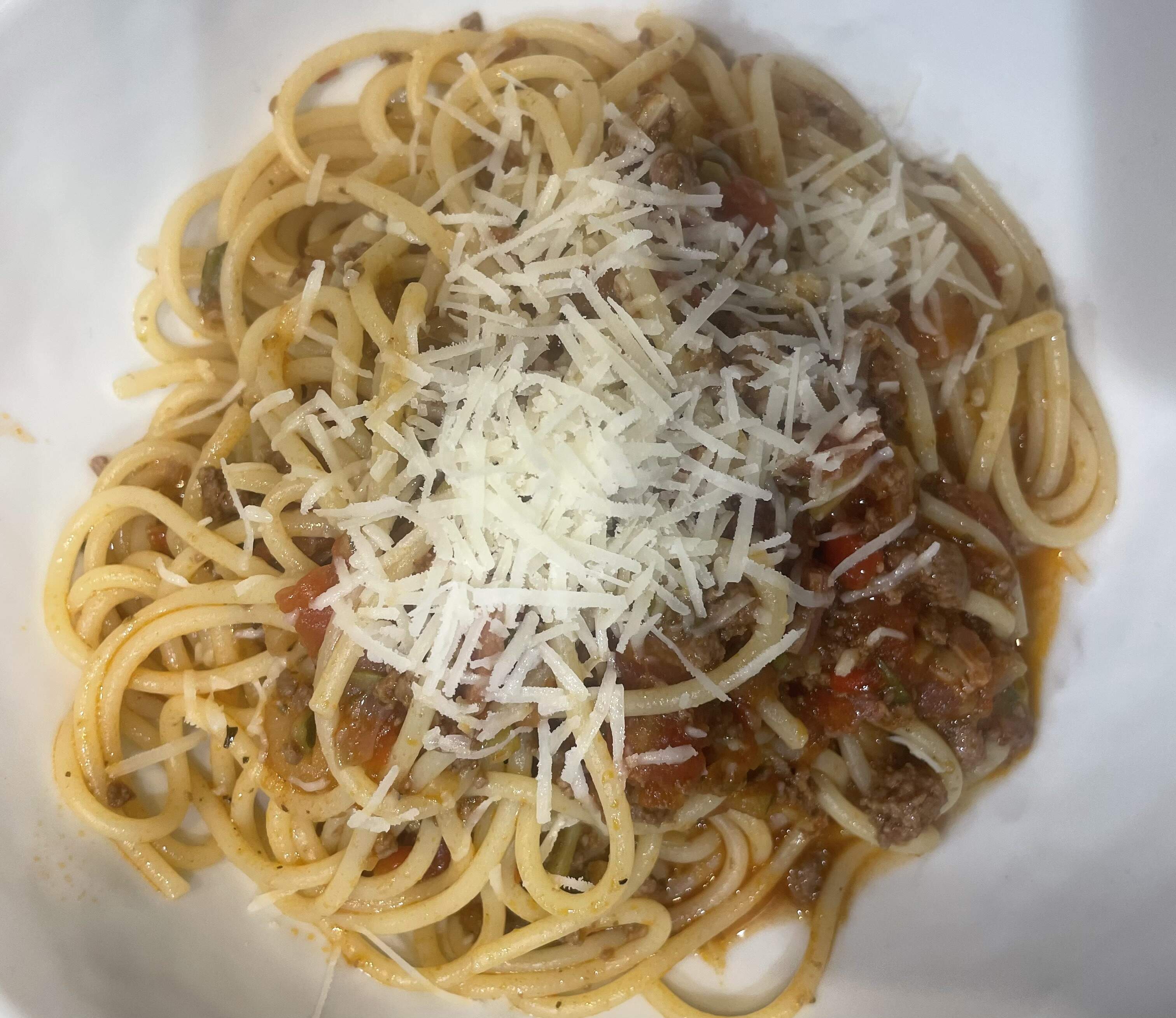 Variation on Bolognese from a German cooking magazine - made with ground beef, shredded vegetables (red bell peppers, zucchini, onions, garlic), bacon, diced tomatoes, tomato paste, red wine, oregano, bay leaves, sugar and vegetable broth. Served over spaghetti and with some pecorino.