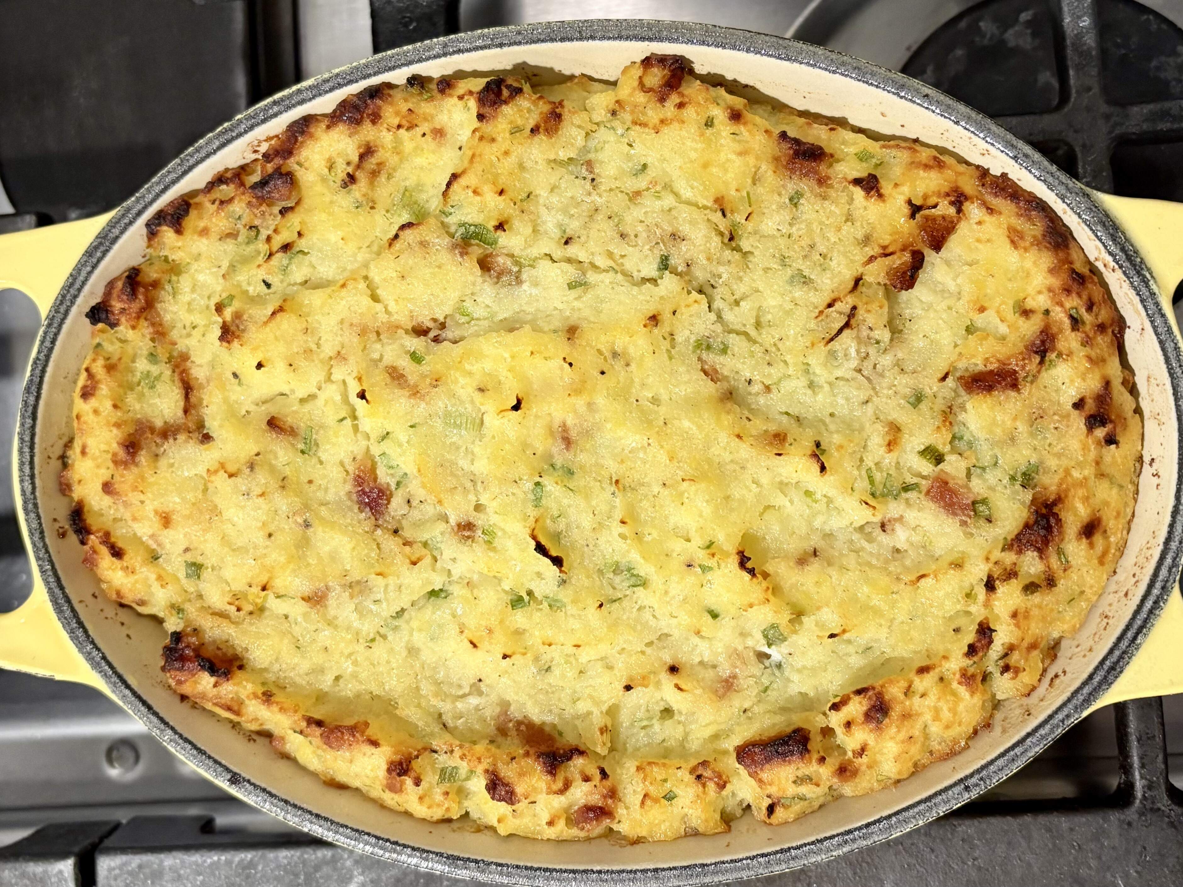 A baked gratin of smashed potatoes, roasted Illinois squash puree, egg, grated gruyere, bacon bits, butter bits, minced scallion, onion salt, nutmeg, S&P.