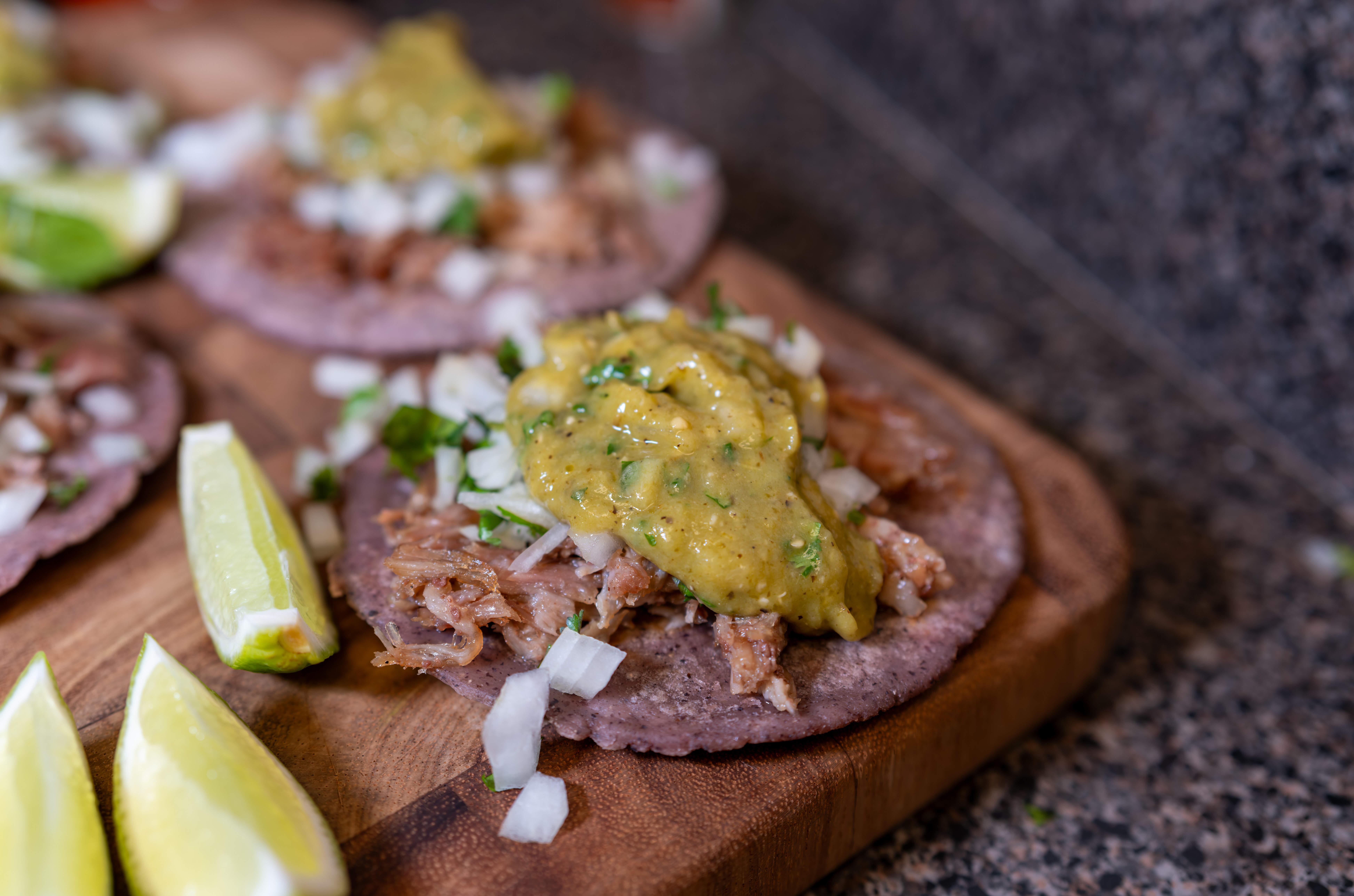 Tonight for taco Tuesday I made some tacos with the carnitas, topped with onion, cilantro, and a roasted tomatillo salsa.