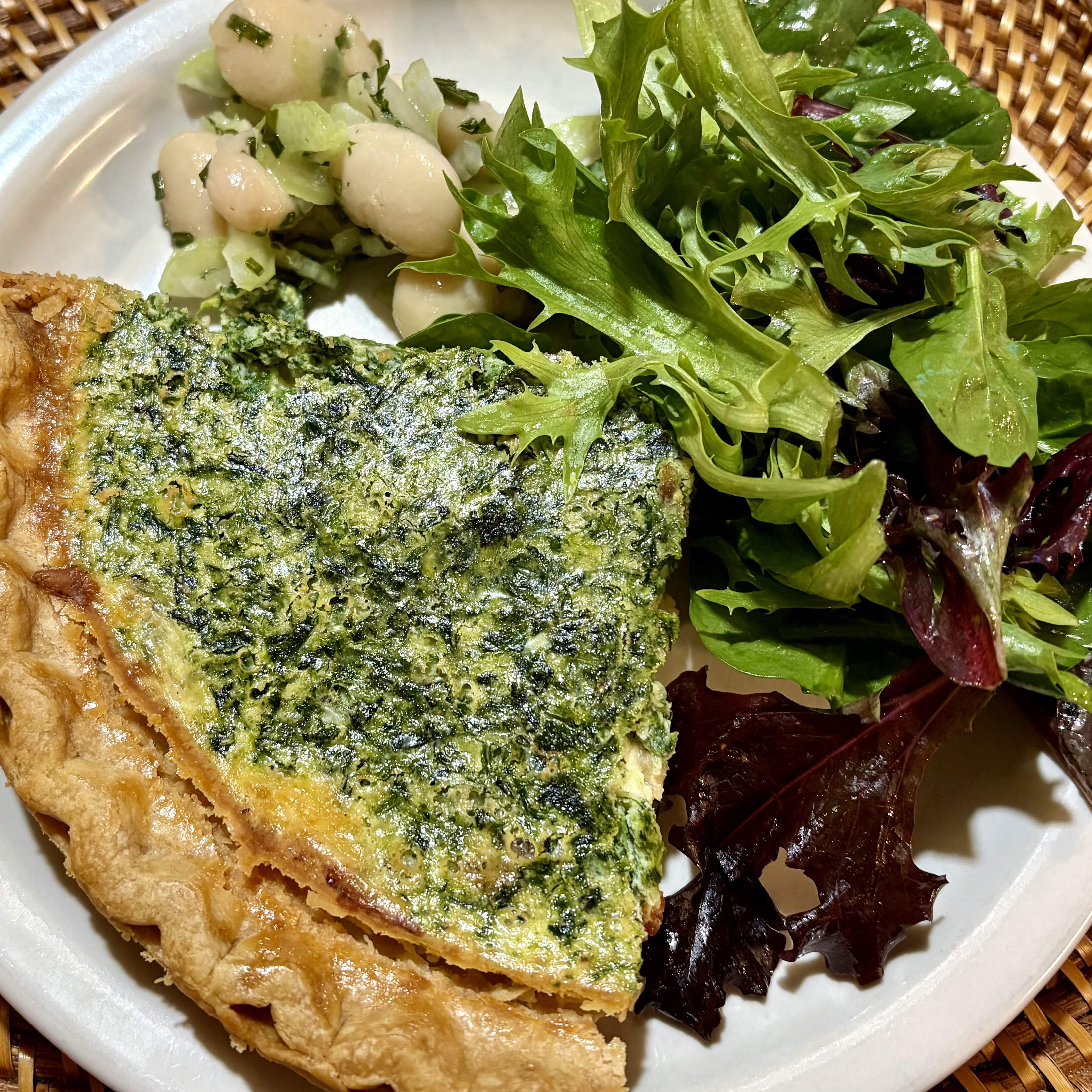 Leftover spinach and bacon quiche from the freezer (reheated). The last of the marinated bean salad. Greens in vinaigrette.