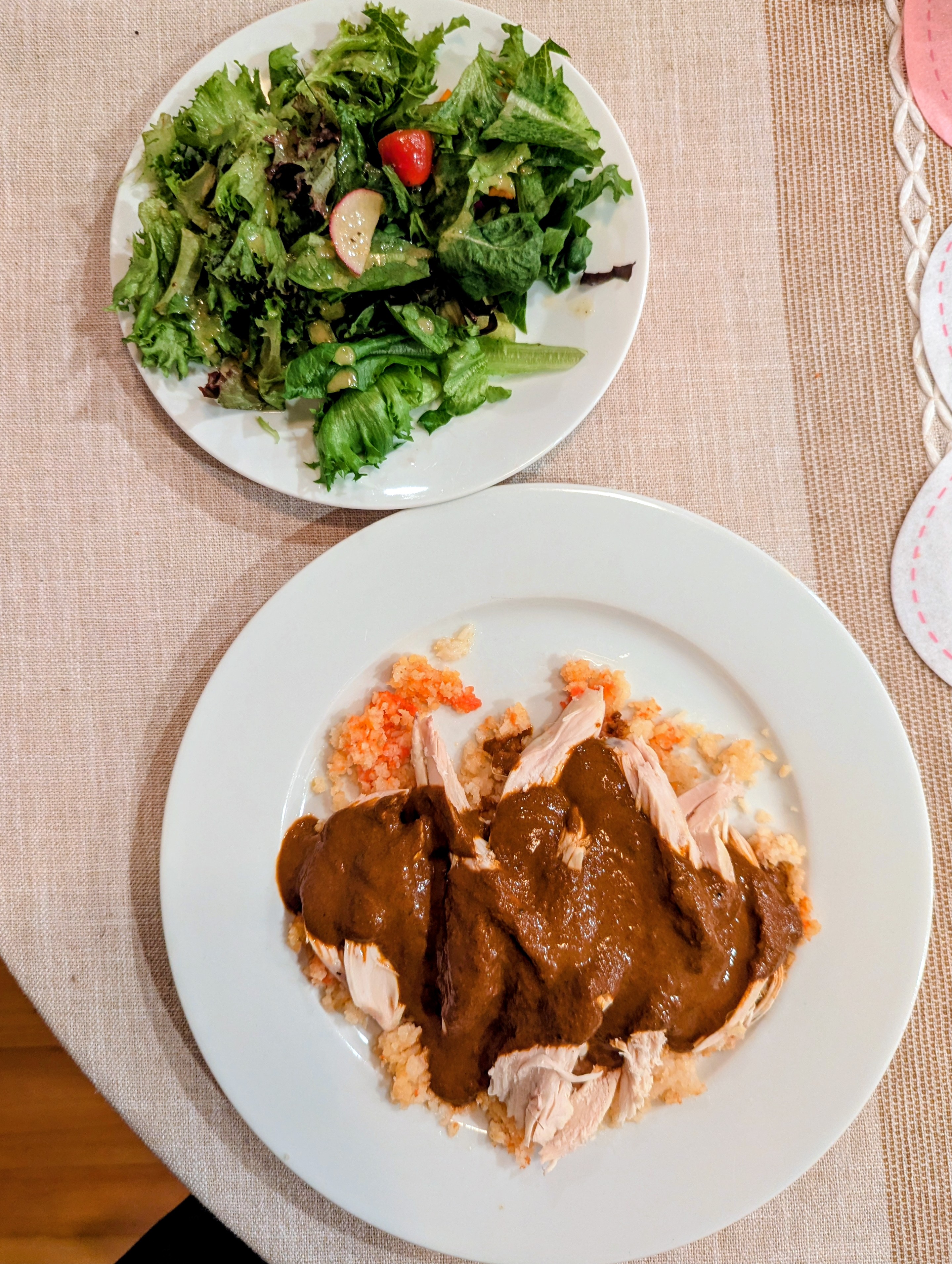 Tuesday we had chicken with the mole sauce and rice my friend dropped off and a big green salad.