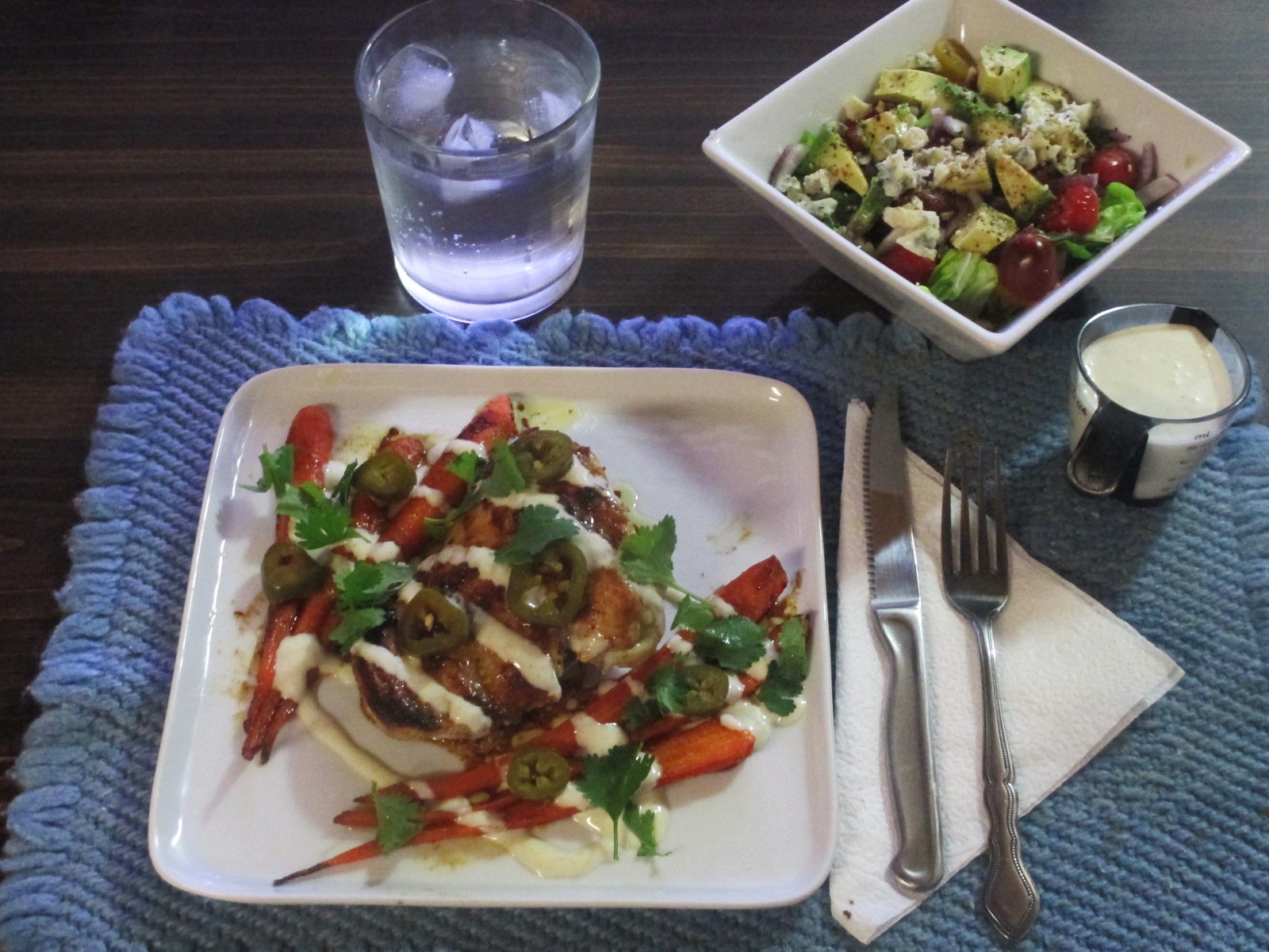 NYT chicken and carrots with yogurt sauce. Little gem, red onion, tomato, avocado, blue cheese salad, ranch dressing. This was delicious.
