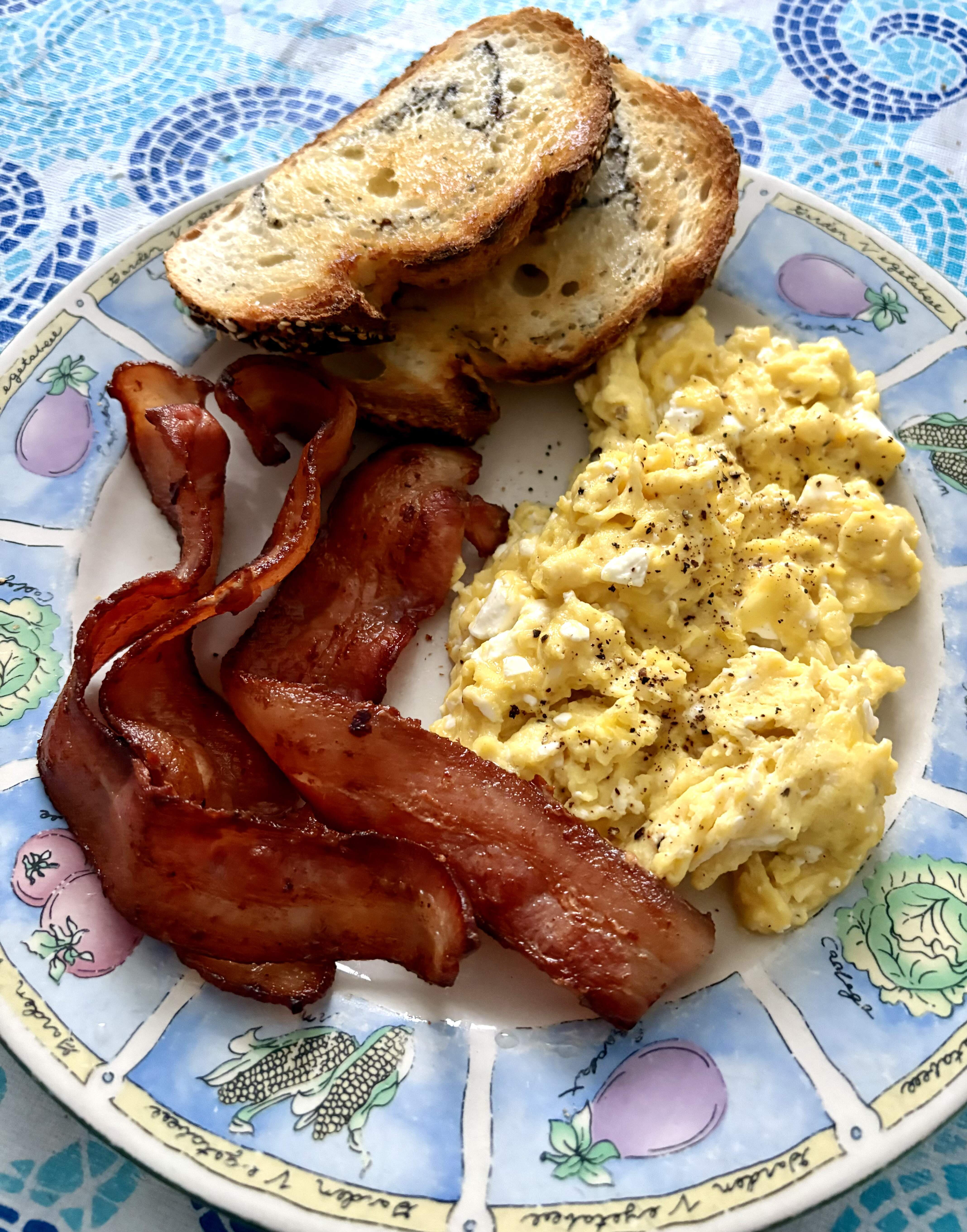 Last night’s dinner plan was thwarted because of a burst water main down the block, so no water for around 8 hours ment no washing of lettuce. I had to pivot to plan B, which was bacon and scrambled eggs with feta and toast. Ah, the joys of winter