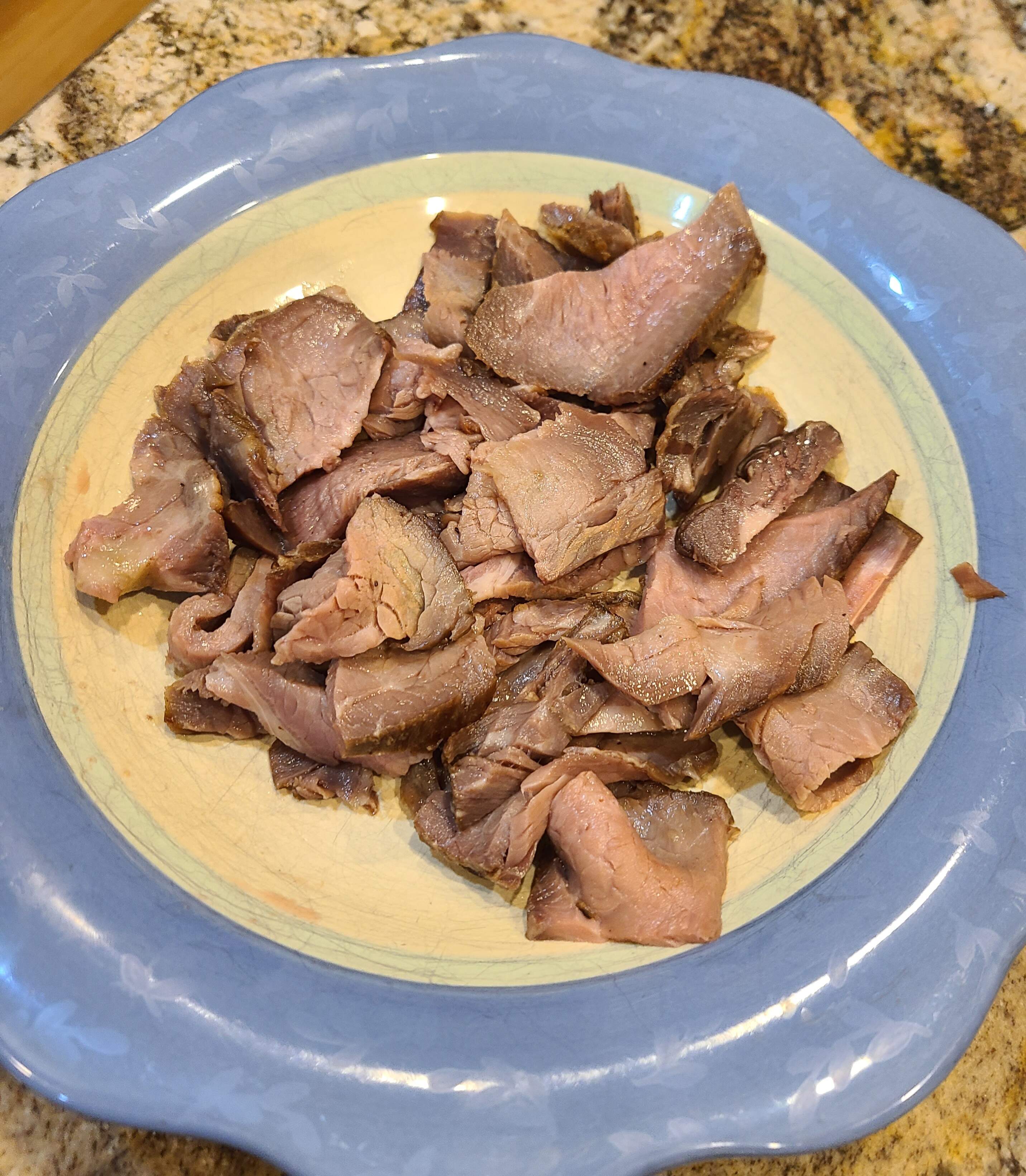 Wife’s gone so it’s my duty to eat as much meat as possible. This was 1.5 pounds of stuff left over from the meatzapaloooza of 1/30 mentioned above. Plus (not shown) about 4 oz leftover Honey Baked Ham.