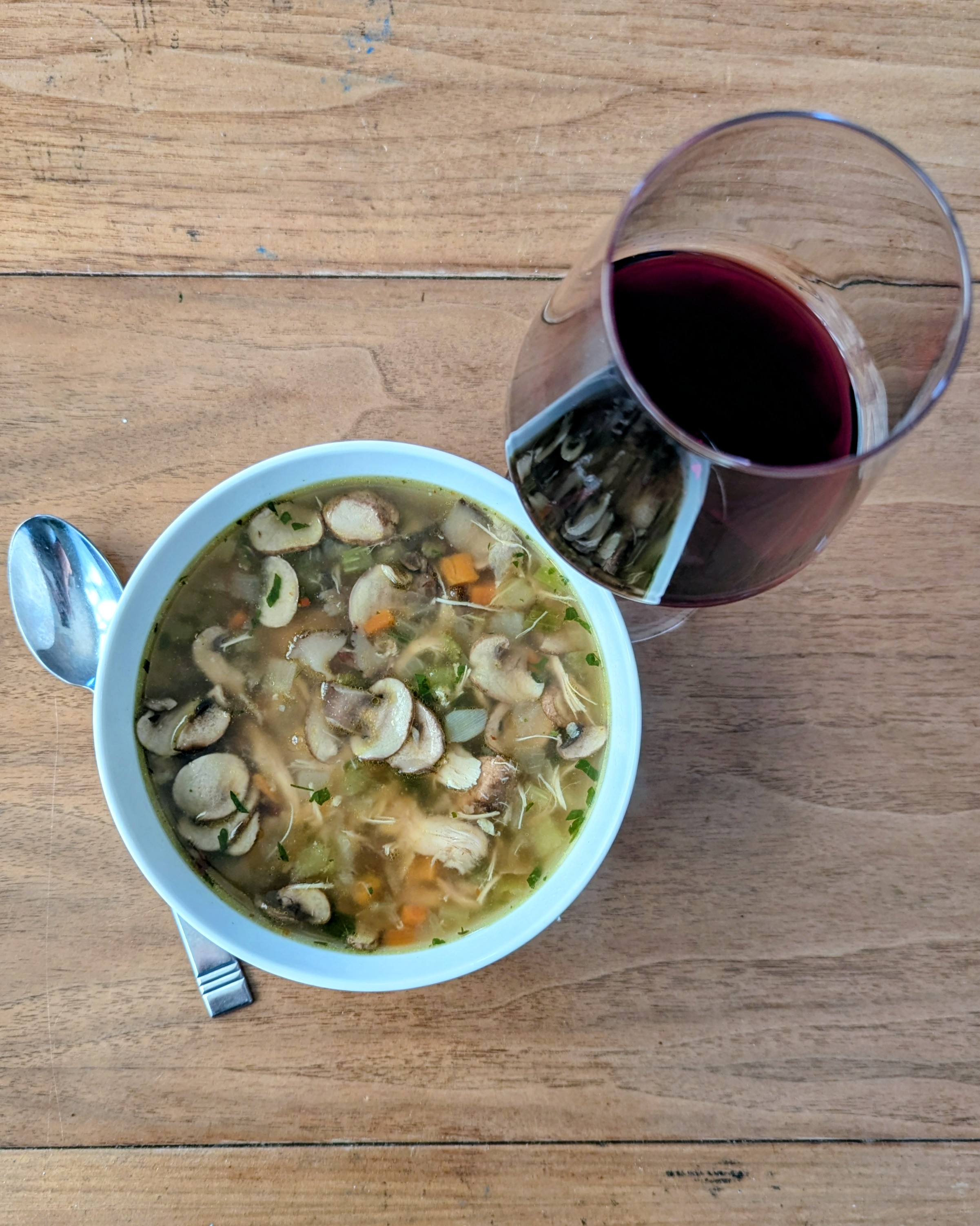 I made chicken-mushroom soup with homemade stock and TJ’s blend of red rice, brown rice, and black barley. Hit the spot.